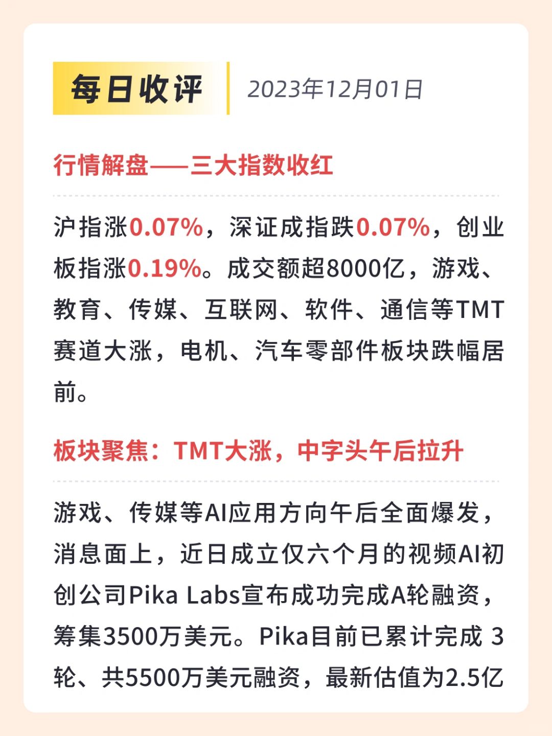 👉 游戏、传媒等AI应用方向午后全面爆发,消息面上,近日成立仅六个月的视频AI初创公司Pika Labs宣布成功完成A轮融资,筹集3500万美元。Pika目前已累计完成 3 轮、共5500万美元融资,最新估值为2.5亿美元。中原证券在近期的研报中指出, AI 技术为传媒内容产业带来的改变将是长期且巨大的,虽然目前 AI 在内容生产领域还处于早期阶段,受限于当前的技术层面限制导致生产的内容在稳定性和一致性上仍有欠缺,还存在较多的场景无法通过 AI 完成,也导致 AI 在内容生产应用环节的渗透率还有较大的提升空间。