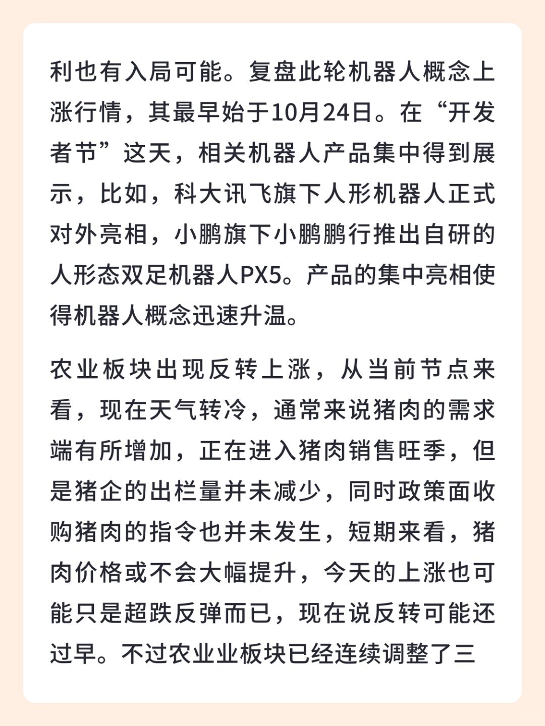 👉 机器人板块大涨,板块催化方面,人形机器人产业迎政策利好,同时特斯拉、亚马逊等人形机器人厂商产业化持续推进,华为成立极目机器全资子公司并申请相关专利也有入局可能。复盘此轮机器人概念上涨行情,其最早始于10月24日。在“开发者节”这天,相关机器人产品集中得到展示,比如,科大讯飞旗下人形机器人正式对外亮相,小鹏旗下小鹏鹏行推出自研的人形态双足机器人PX5。产品的集中亮相使得机器人概念迅速升温。