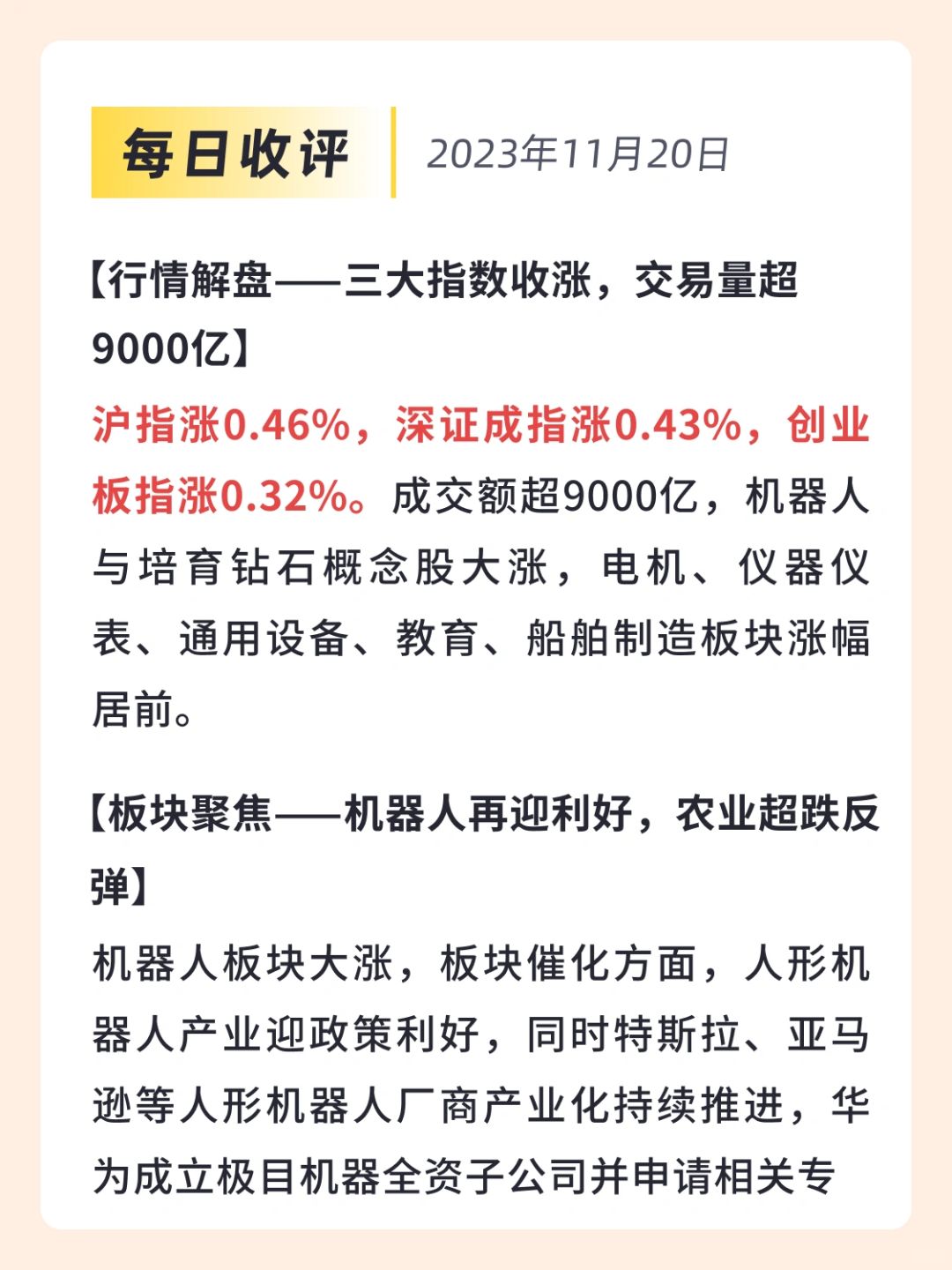 👉 沪指涨0.46%,深证成指涨0.43%,创业板指涨0.32%。成交额超9000亿,机器人与培育钻石概念股大涨,电机、仪器仪表、通用设备、教育、船舶制造板块涨幅居前。