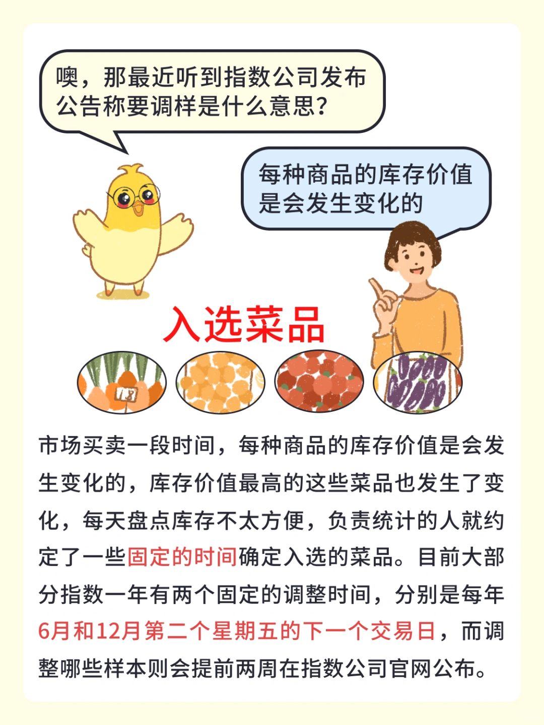 [集美R]市场买卖一段时间,每种商品的库存价值是会发生变化的,库存价值最高的这些菜品也发生了变化,每天盘点库存不太方便,负责统计的人就约定了一些固定的时间确定入选的菜品。目前大部分指数一年有两个固定的调整时间,分别是每年6月和12月第二个星期五的下一个交易日,而调整哪些样本则会提前两周在指数公司官网公布。