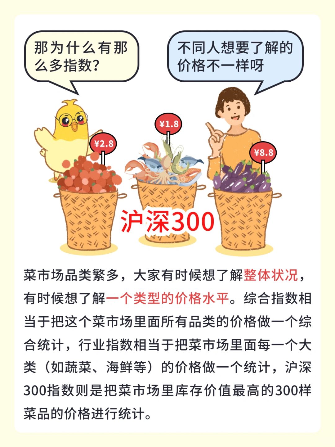[集美R]不同人想要了解的价格不一样,菜市场品类繁多,大家有时候想了解整体状况,有时候想了解一个类型的价格水平。综合指数相当于把这个菜市场里面所有品类的价格做一个综合统计,行业指数相当于把菜市场里面每一个大类(如蔬菜、海鲜等)的价格做一个统计,沪深300指数则是把菜市场里库存价值最高的300样菜品的价格进行统计。