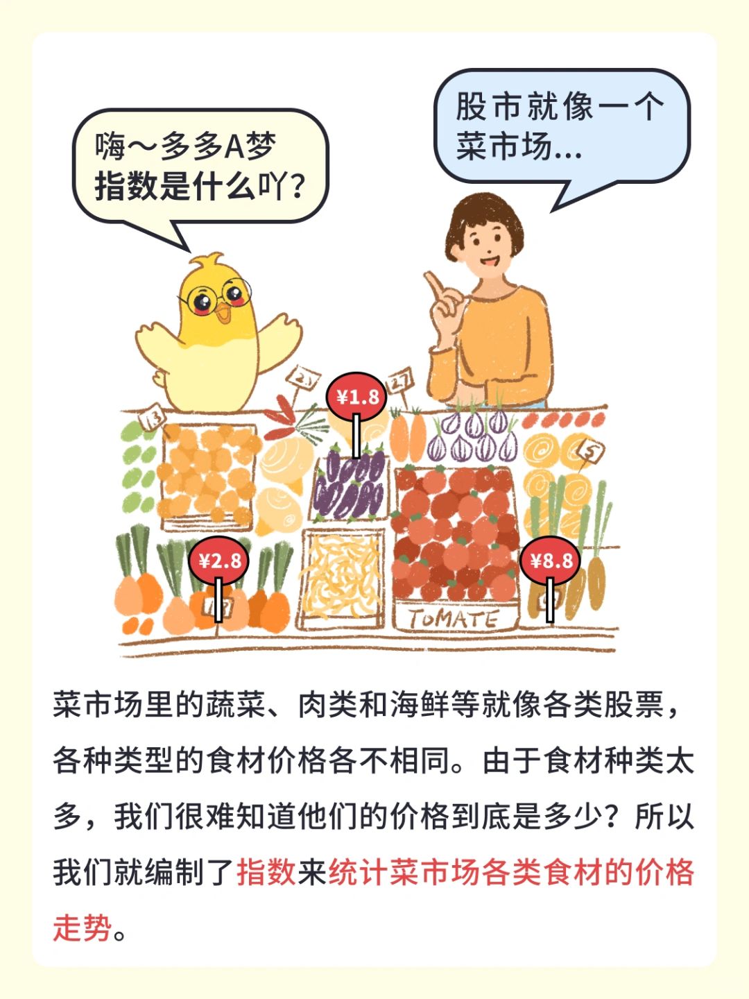 [集美R]股市就像一个菜市场,菜市场里的蔬菜、肉类和海鲜等就像各类股票,各种类型的食材价格各不相同。由于食材种类太多,我们很难知道他们的价格到底是多少?所以我们就编制了指数来统计菜市场各类食材的价格走势。