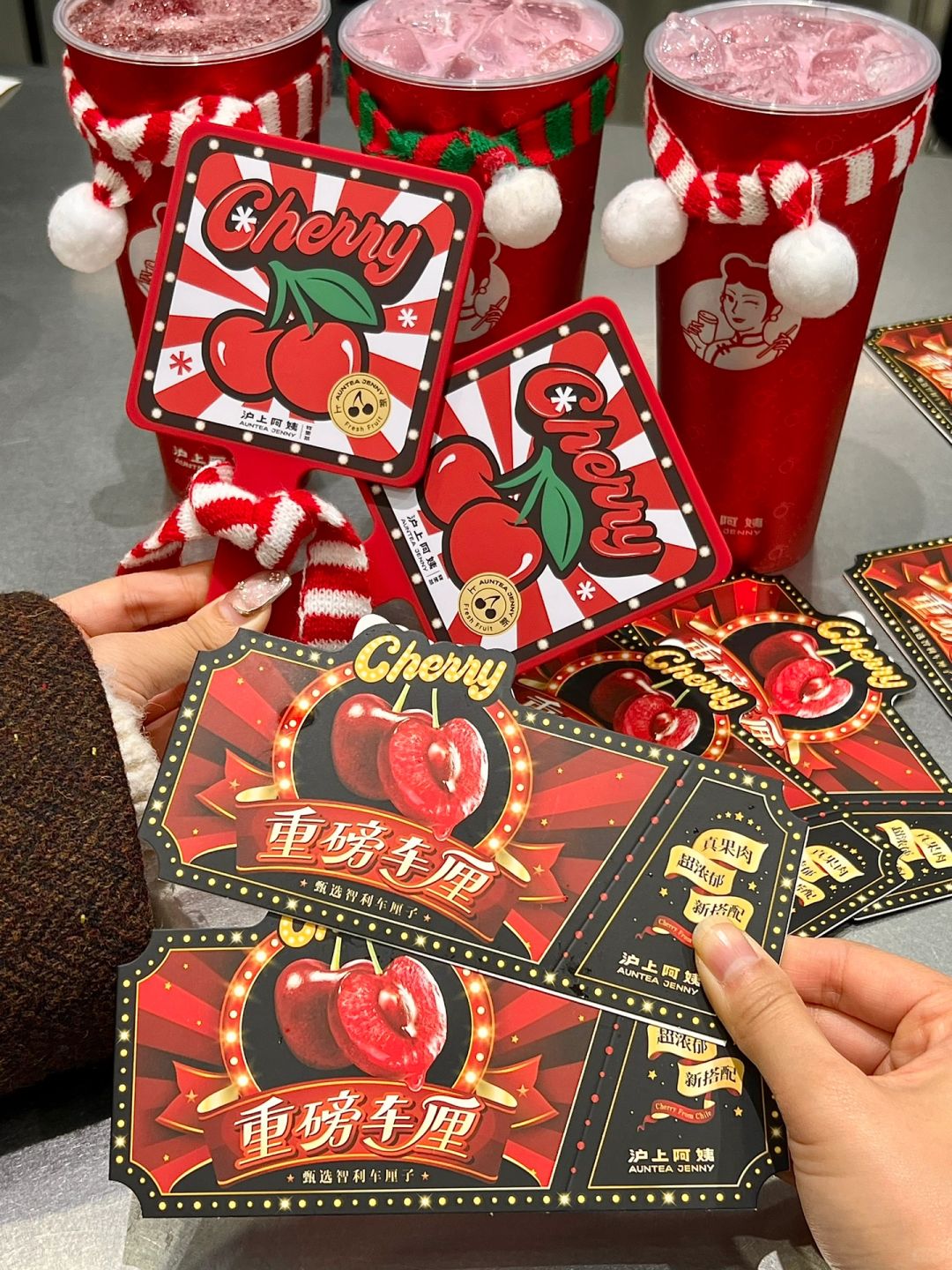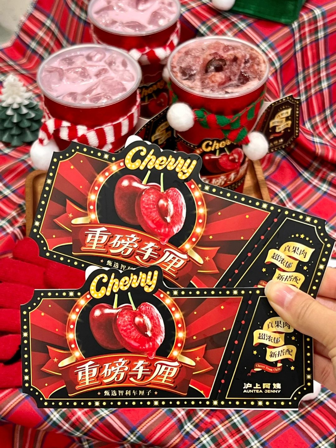沪上阿姨!你是懂圣诞🎄的好吗!!!! 年末了居然出了王炸新品车厘子🍒!!!! 马戏团元素和车厘子🍒太有节日氛围啦!! 手持镜和马戏团票根杯套也hinhin好看!!! . 🍓多肉车厘莓莓 我坠坠坠爱的一杯❤️ 智利车厘子➕新鲜的红颜草莓 双重果肉!谁懂这一杯的含金量啊。。。酸酸甜甜的,茶香果香融合的恰到好处! 🍒车厘大福 料多多星人的坠爱!里面加了duangduang的奶冻和QQ弹弹的米麻薯!口感层次丰富!好喝哭😭😭