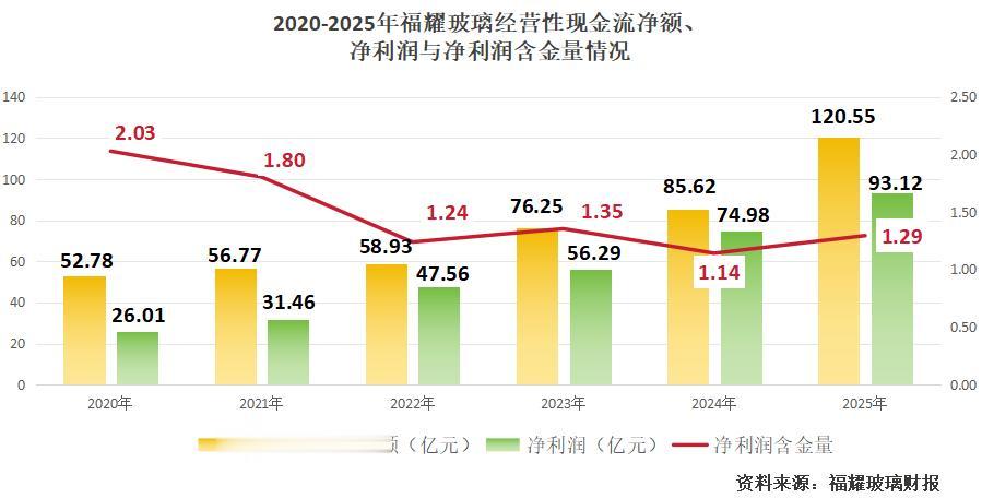 2020-2025年,福耀玻璃经营性现金流净额不仅稳步提升,而且一直高于当期净利润。2025年,公司经营性现金流净额高达120.55亿元,再创下新高,净利润含金量一直在1以上。