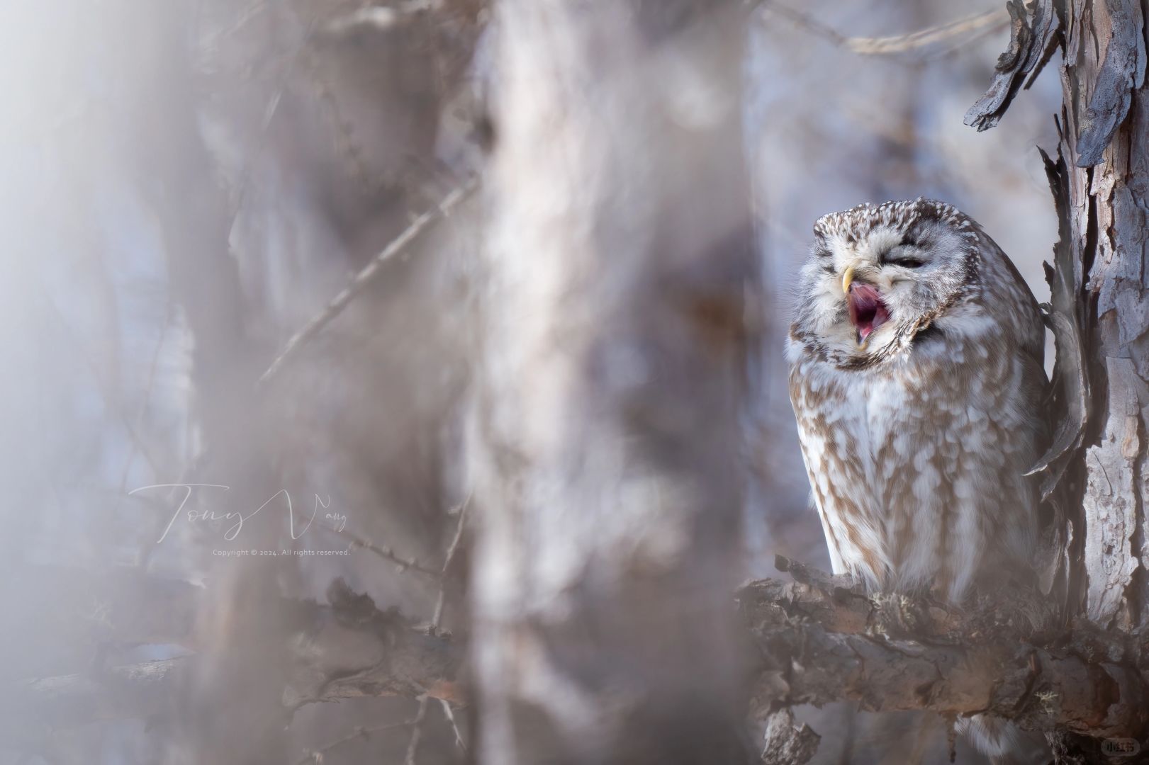 第一次见白天的鬼鸮,真如大家所传说的那样,鬼鸮并不是特别怕人。即使两辆越野车开来,它也依旧表现得十分放松。山沟里没有信号,我们赶紧让司机去另一条山沟接上队友。来来回回将近三小时,鬼鸮都安逸地在松树上休息,任凭大家的快门声如何热烈,都纹丝不动。