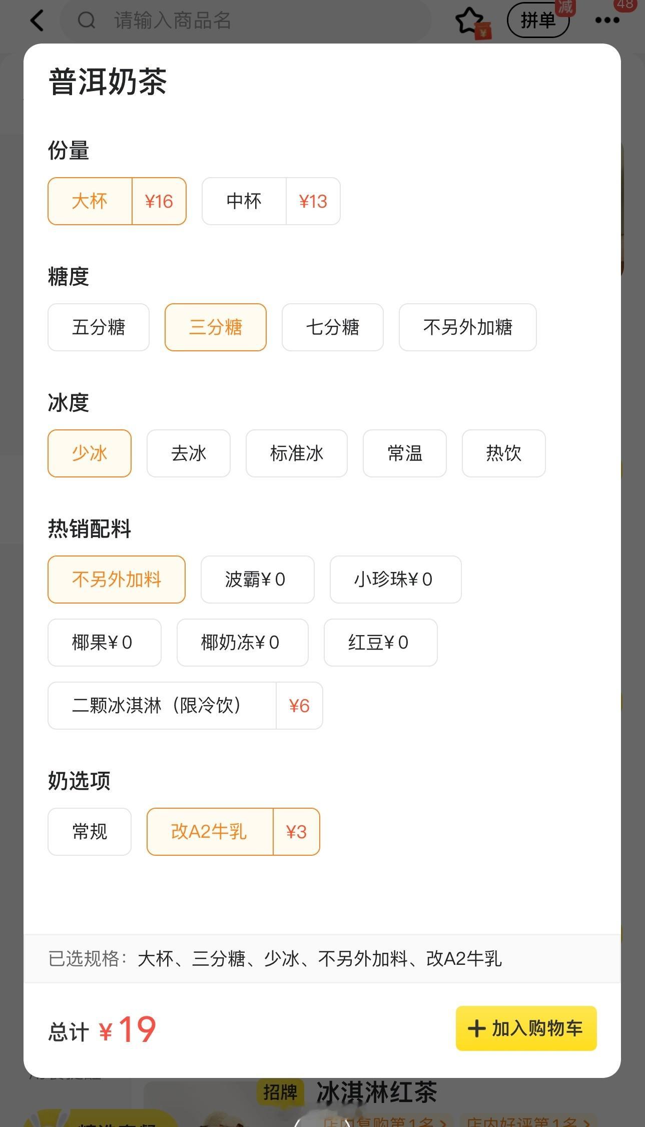 喝上一点点的普洱奶茶了!看到别人说像港奶我才点的,是有点像但是没有港奶那么浓!普洱的味道挺明显的,这杯茶味偏重ʕ •ᴥ•ʔ甜度的话,我喝茶颜三分糖刚好,这杯我备注要了一分糖感觉OK!完全不甜不腻很清爽!