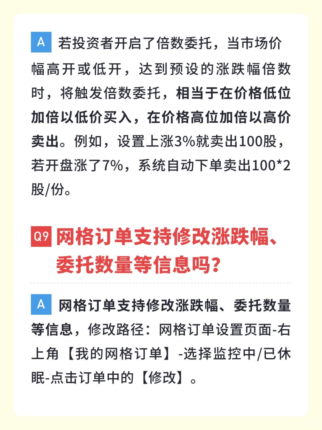 若投资者开启了倍数委托,当市场价幅高开或低开,达到预设的涨跌幅倍数时,将触发倍数委托,相当于在价格低位加倍以低价买入,在价格高位加倍以高价卖出。例如,设置上涨3%就卖出100股,若开盘涨了7%,系统自动下单卖出100*2 股/份