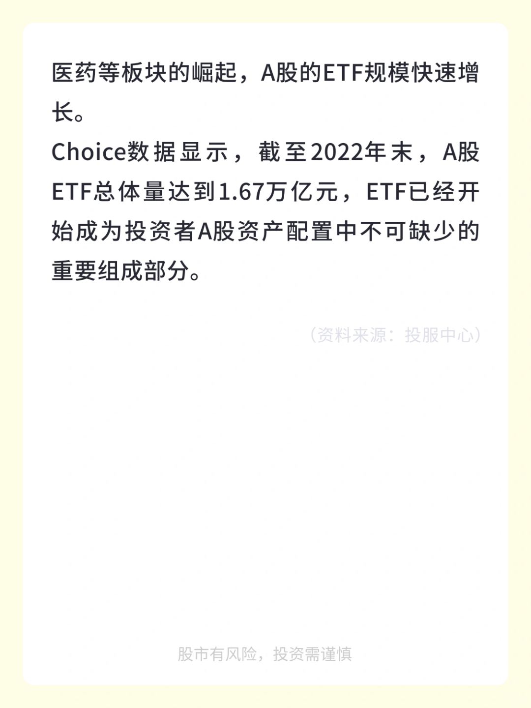 • 第二阶段是2018至今,伴随着2018年出现的牛市,特别是芯片、新能源、光伏、医药等板块的崛起,A股的ETF规模快速增长。Choice数据显示,截至2022年末,A股ETF总体量达到1.67万亿元,ETF已经开始成为投资者A股资产配置中不可缺少的重要组成部分。
