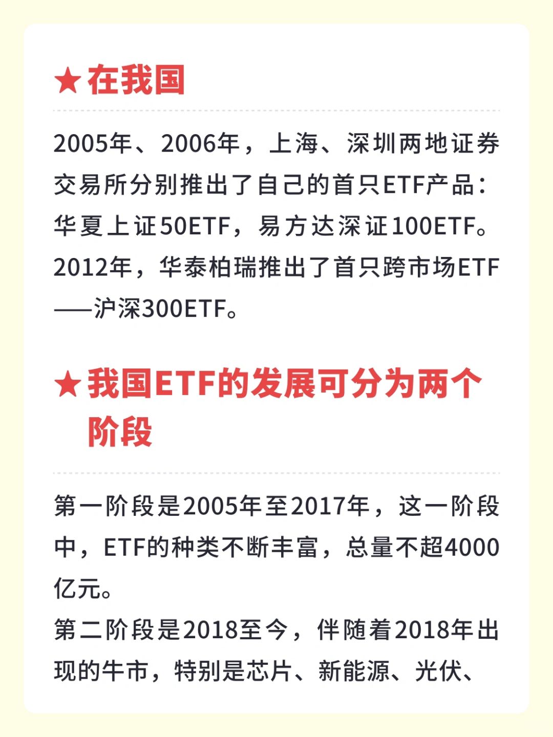 [向右R]在我国,2005年、2006年,上海、深圳两地证券交易所分别推出了自己的首只ETF产品:华夏上证50ETF,易方达深证100ETF。2012年,华泰柏瑞推出了首只跨市场ETF——沪深300ETF。