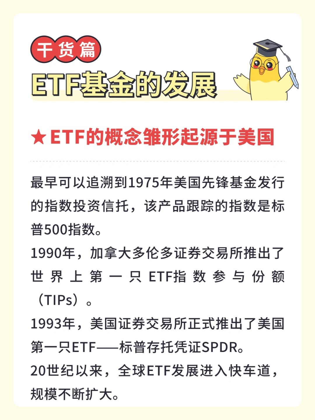 [向右R]ETF的概念雏形起源于美国,最早可以追溯到1975年美国先锋基金发行的指数投资信托,该产品跟踪的指数是标普500指数。1990年,加拿大多伦多证券交易所推出了世界上第一只ETF指数参与份额(TIPs)。1993年,美国证券交易所正式推出了美国第一只ETF——标普存托凭证SPDR。20世纪以来,全球ETF发展进入快车道,规模不断扩大。