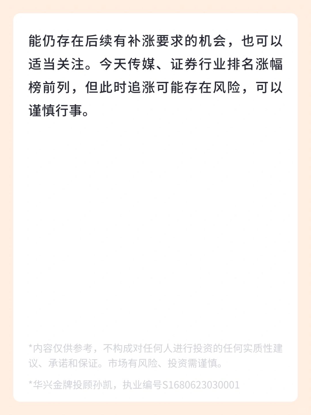[向右R]行业方面,依然可以考虑关注相对低位箱底企稳类型的行业,如家用电器、钢铁等。此外,在医药、元器件等行业中,可能仍存在后续有补涨要求的机会,也可以适当关注。今天传媒、证券行业排名涨幅榜前列,但此时追涨可能存在风险,可以谨慎行事。