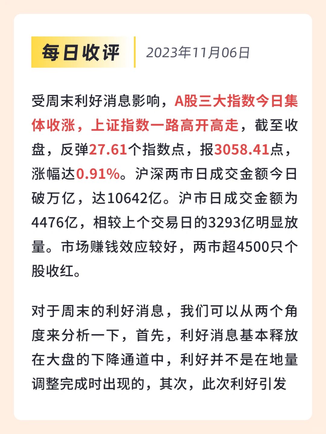 [向右R]受周末利好消息影响,A股三大指数今日集体收涨,上证指数一路高开高走,截至收盘,反弹27.61个指数点,报3058.41点,涨幅达0.91%。沪深两市日成交金额今日破万亿,达10642亿。沪市日成交金额为4476亿,相较上个交易日的3293亿明显放量。市场赚钱效应较好,两市超4500只个股收红。