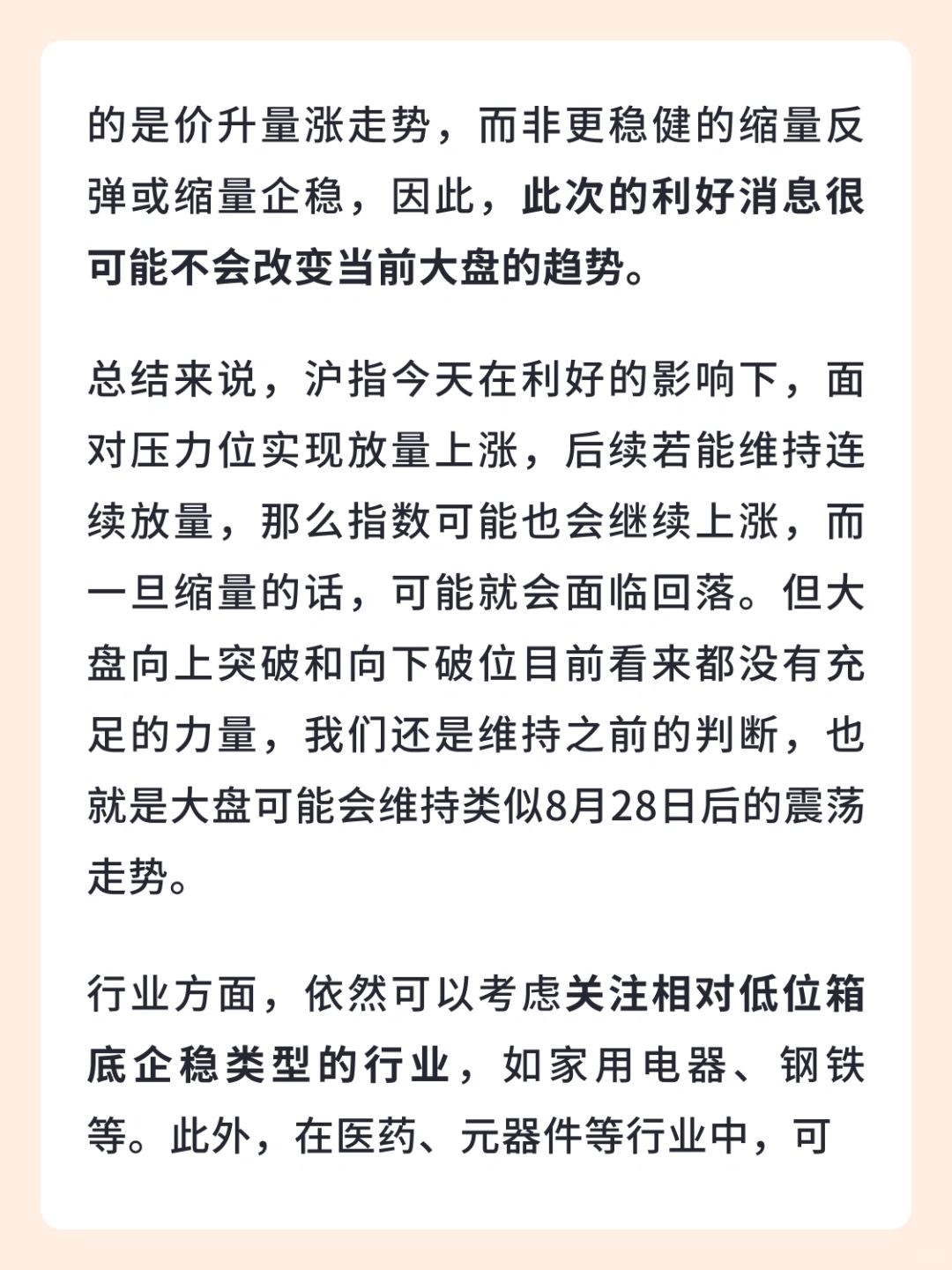 [向右R]总结来说,沪指今天在利好的影响下,面对压力位实现放量上涨,后续若能维持连续放量,那么指数可能也会继续上涨,而一旦缩量的话,可能就会面临回落。但大盘向上突破和向下破位目前看来都没有充足的力量,我们还是维持之前的判断,也就是大盘可能会维持类似8月28日后的震荡走势。
