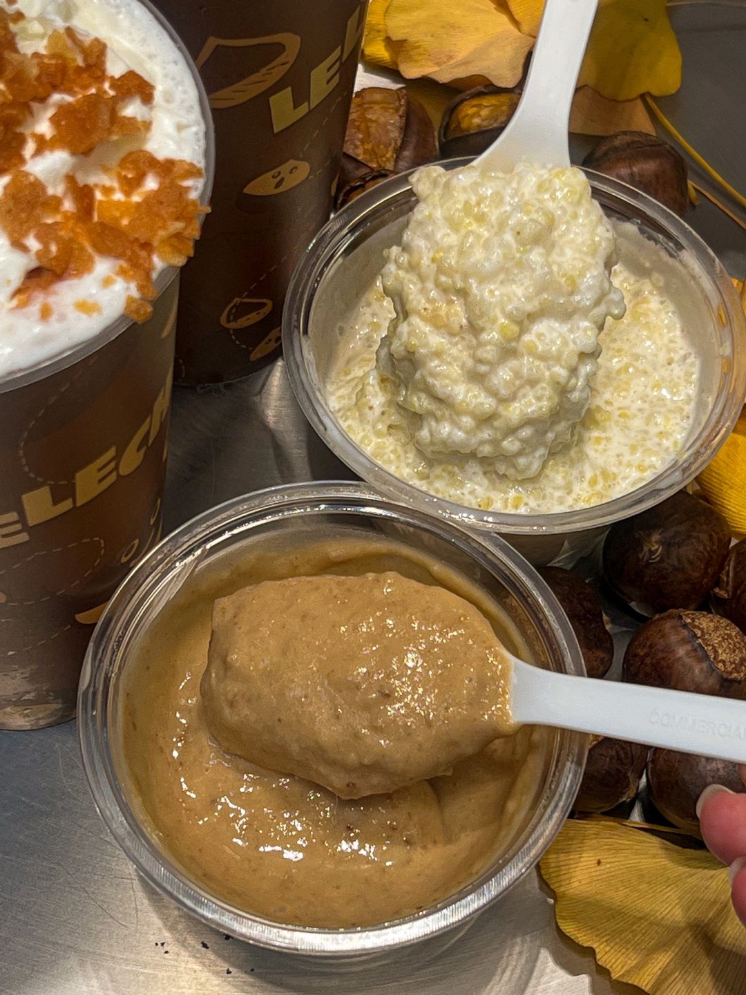 栗子脑袋一整个狂喜!绵密的奶油顶上洒满了黄油薄脆片,猛吸一口能吃到香甜软糯的栗子泥~底下还有糯叽叽的大黄米!好适合秋冬天喝啊