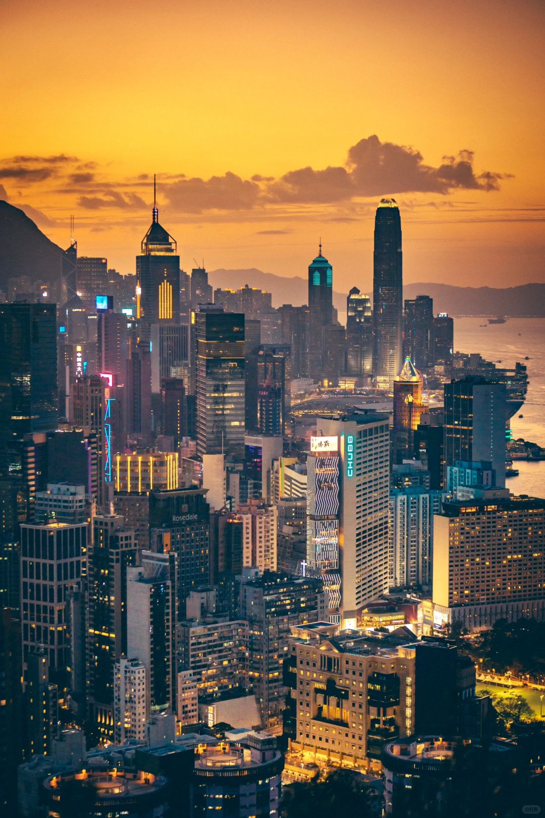 中银大厦北门花园道1号的Garden Road——香港警政大楼前的天桥——军器厂街——北角春秧街——北角道英皇道交叉口天桥——百福道安全城——怪兽大厦——宝马山(🌄日落夜景)