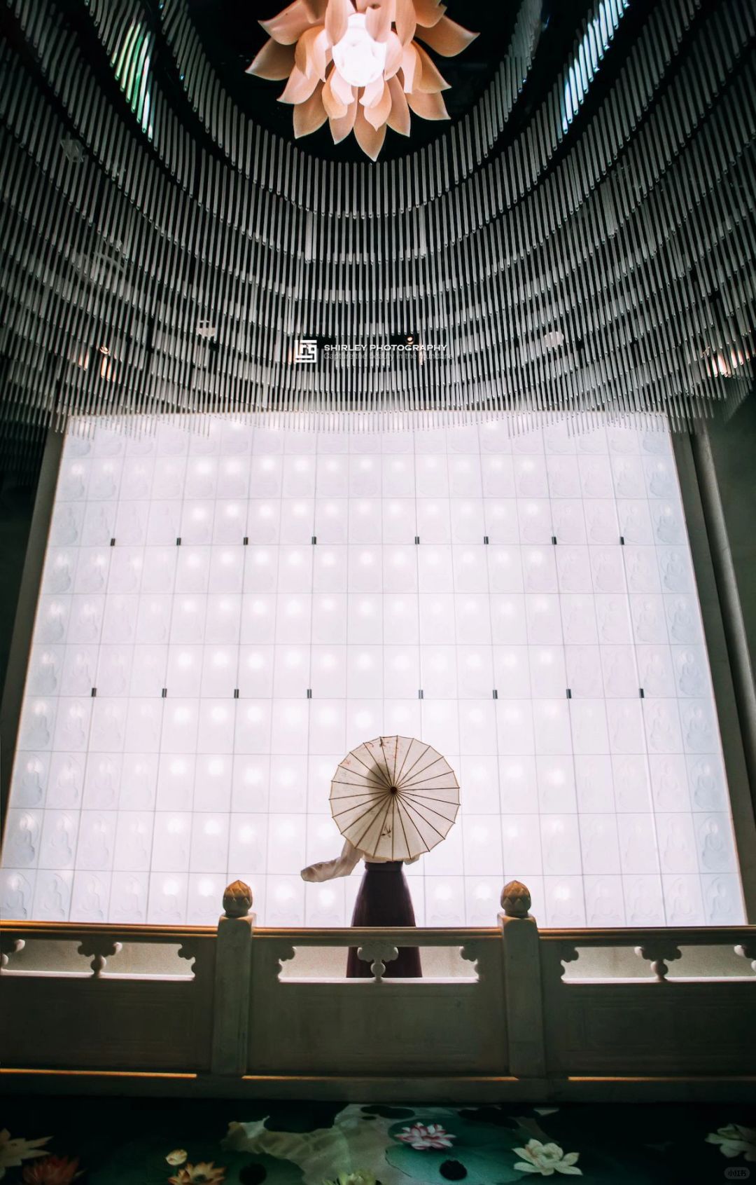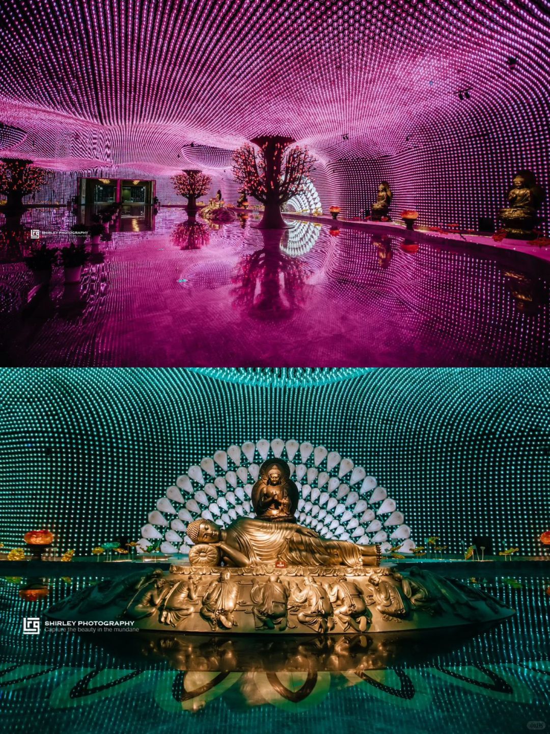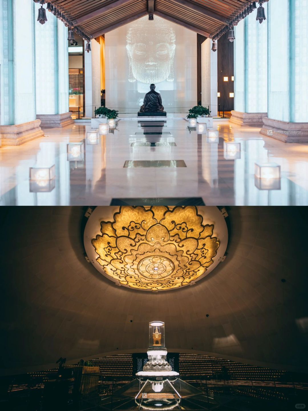 也是一个穹窿式空间,镜面玻璃反射之下更加色彩斑斓。空间中设置有“生命树”,垂下数万条犹如柳枝般的光纤,象征众生同根同脉、共生共荣。一旁菩提树下,一尊纯白的佛像静静打坐,场景神圣唯美,不知贡献了多少笔记封面