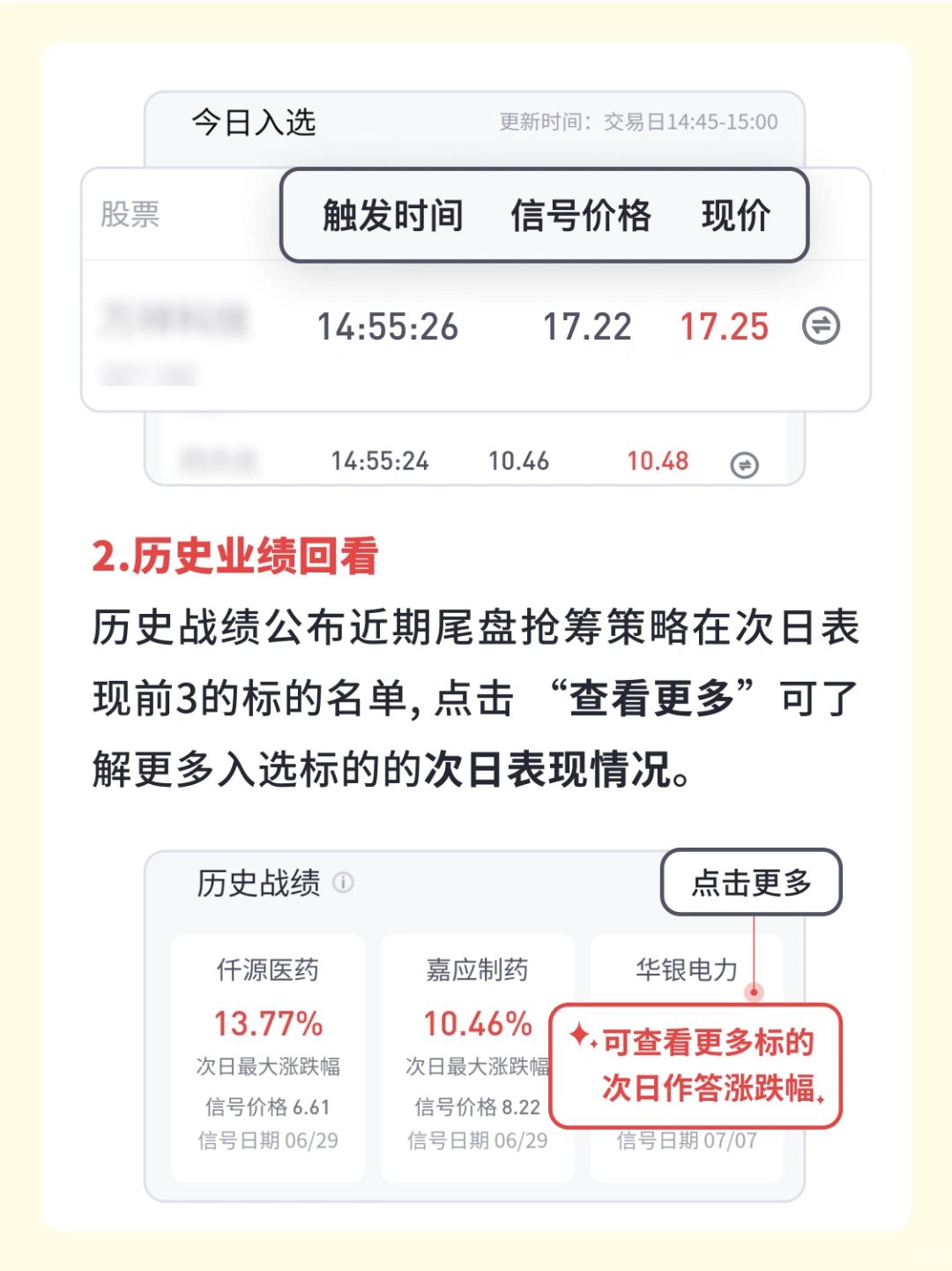 历史战绩公布近期尾盘抢筹策略在次日表现前3的标的名单, 点击 “查看更多”可了解更多入选标的的次日表现情况。