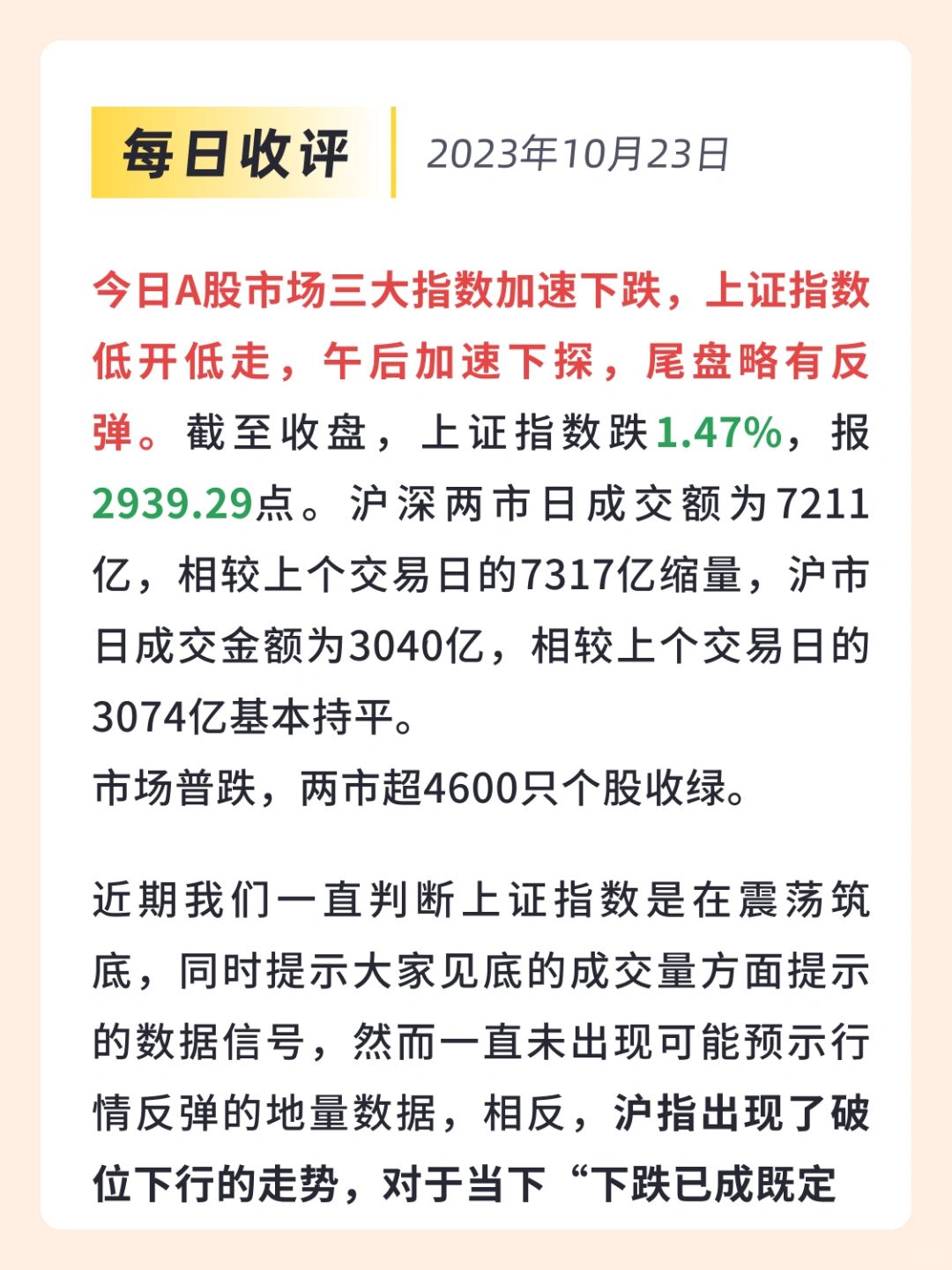 [向右R]今日A股市场三大指数加速下跌,上证指数低开低走,午后加速下探,尾盘略有反弹。截至收盘,上证指数跌1.47%,报2939.29点。沪深两市日成交额为7211亿,相较上个交易日的7317亿缩量,沪市日成交金额为3040亿,相较上个交易日的3074亿基本持平。市场普跌,两市超4600只个股收绿。