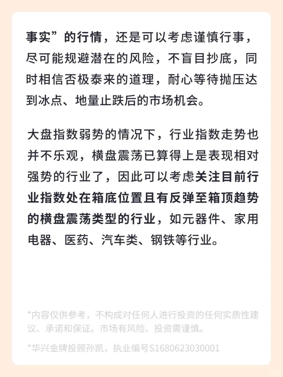 [向右R]大盘指数弱势的情况下,行业指数走势也并不乐观,横盘震荡已算得上是表现相对强势的行业了,因此可以考虑关注目前行业指数处在箱底位置且有反弹至箱顶趋势的横盘震荡类型的行业,如元器件、家用电器、医药、汽车类、钢铁等行业。