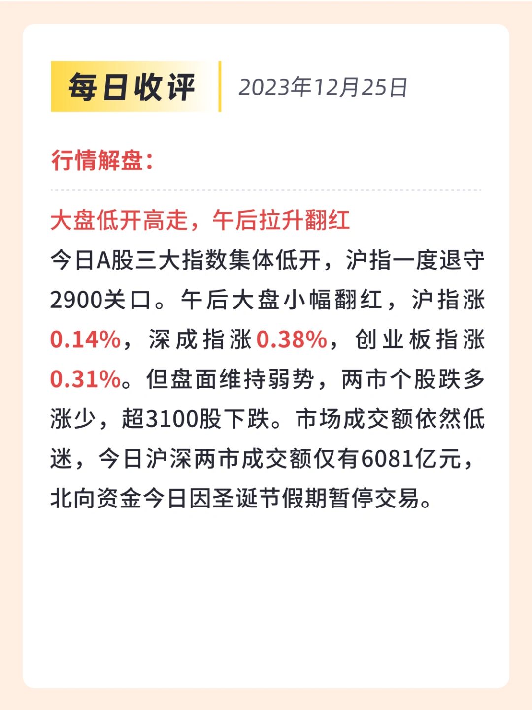 👉12月25日,A股三大指数集体低开,沪指一度退守2900关口。午后大盘小幅翻红,沪指涨0.14%,深成指涨0.38%,创业板指涨0.31%。但盘面维持弱势,两市个股跌多涨少,超3100股下跌。市场成交额依然低迷,今日沪深两市成交额仅有6081亿元,北向资金今日因圣诞节假期暂停交易。