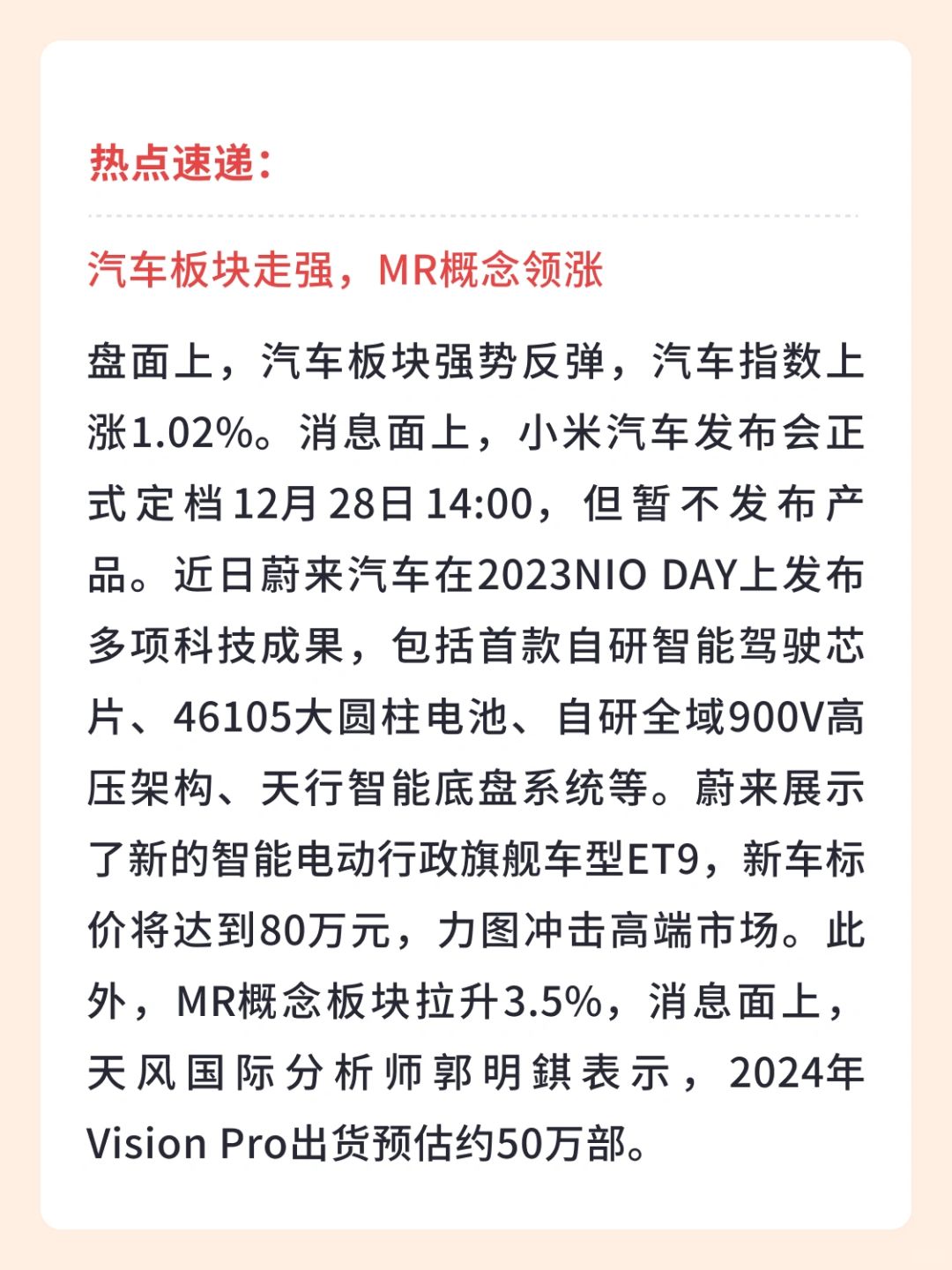 👉盘面上,汽车板块强势反弹,汽车指数上涨1.02%。消息面上,小米汽车发布会正式定档12月28日14:00,但暂不发布产品。近日蔚来汽车在2023NIO DAY上发布多项科技成果,包括首款自研智能驾驶芯片、46105大圆柱电池、自研全域900V高压架构、天行智能底盘系统等。蔚来展示了新的智能电动行政旗舰车型ET9,新车标价将达到80万元,力图冲击高端市场。此外,MR概念板块拉升3.5%,消息面上,天风国际分析师郭明錤表示,2024年Vision Pro出货预估约50万部。目前Vision Pro已量产,预计在2024年1月首周开始大量出货。随着MR技术应用推广,市场对相关产业链公司的前景表现出信心。
