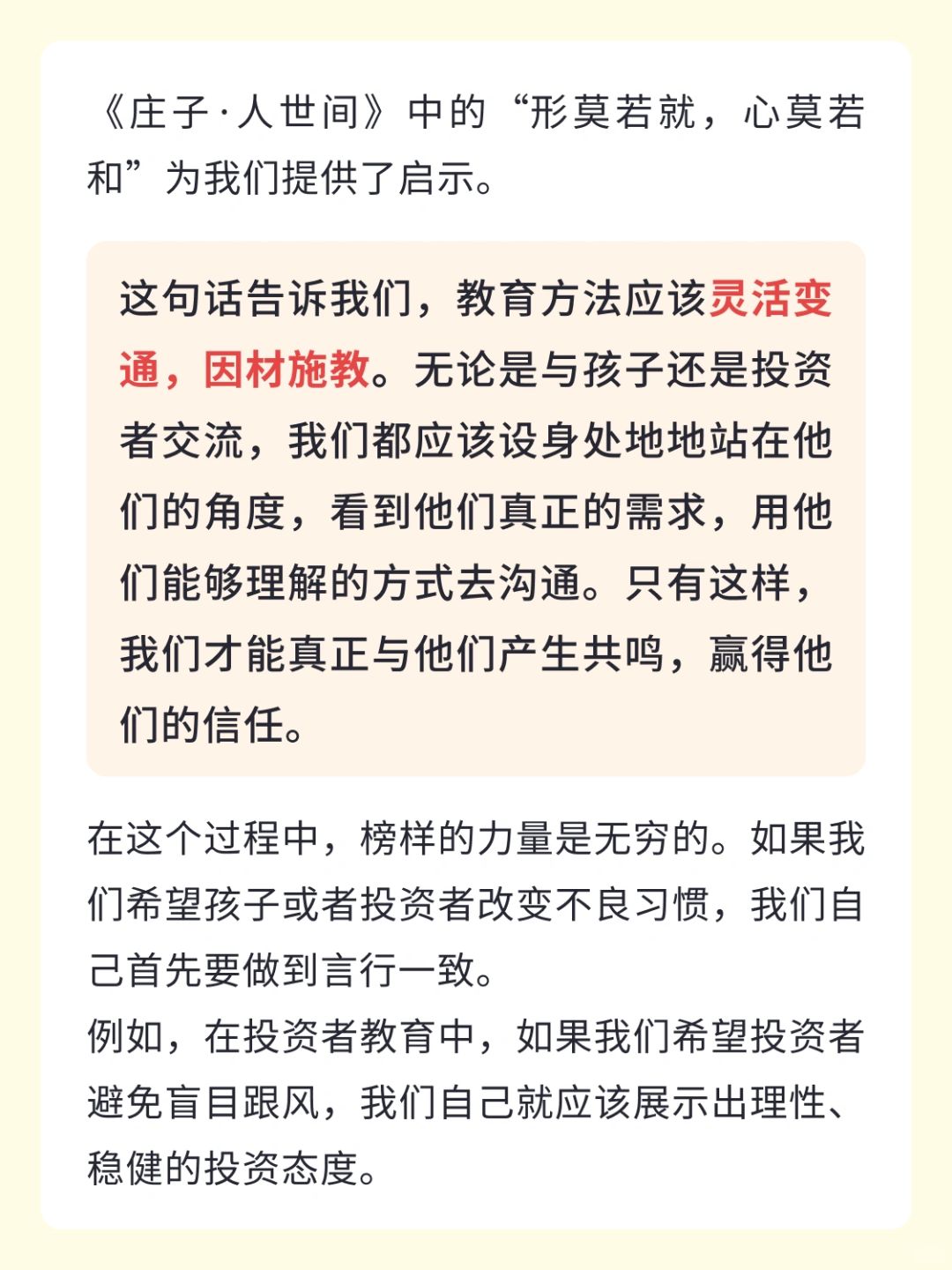 《庄子·人世间》中的“形莫若就,心莫若和”为我们提供了启示。这句话告诉我们,教育方法应该灵活变通,因材施教。无论是与孩子还是投资者交流,我们都应该设身处地地站在他们的角度,看到他们真正的需求,用他们能够理解的方式去沟通。只有这样,我们才能真正与他们产生共鸣,赢得他们的信任。