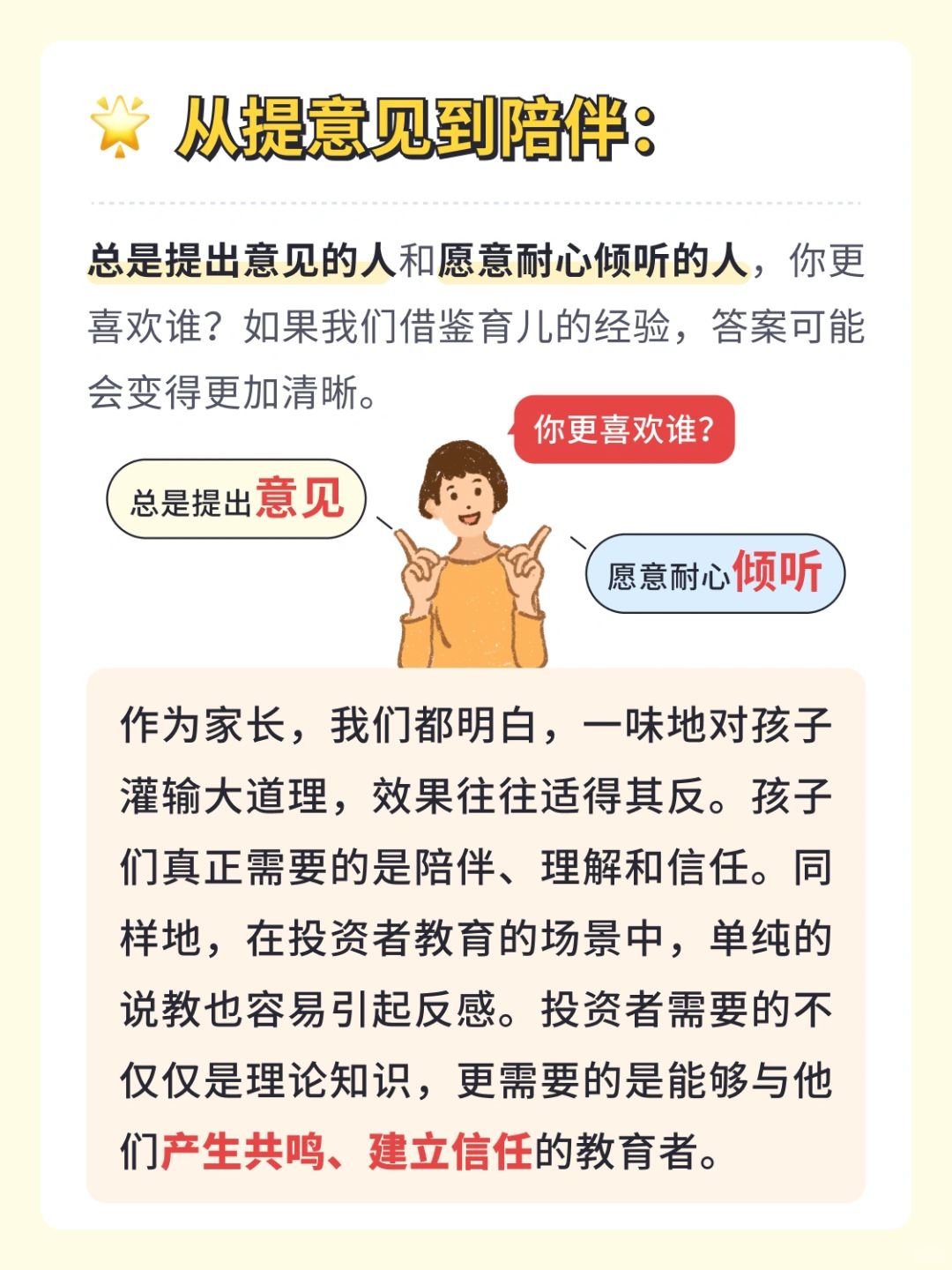 [集美R]作为家长,我们都明白,一味地对孩子灌输大道理,效果往往适得其反。孩子们真正需要的是陪伴、理解和信任。同样地,在投资者教育的场景中,单纯的说教也容易引起反感。投资者需要的不仅仅是理论知识,更需要的是能够与他们产生共鸣、建立信任的教育者。