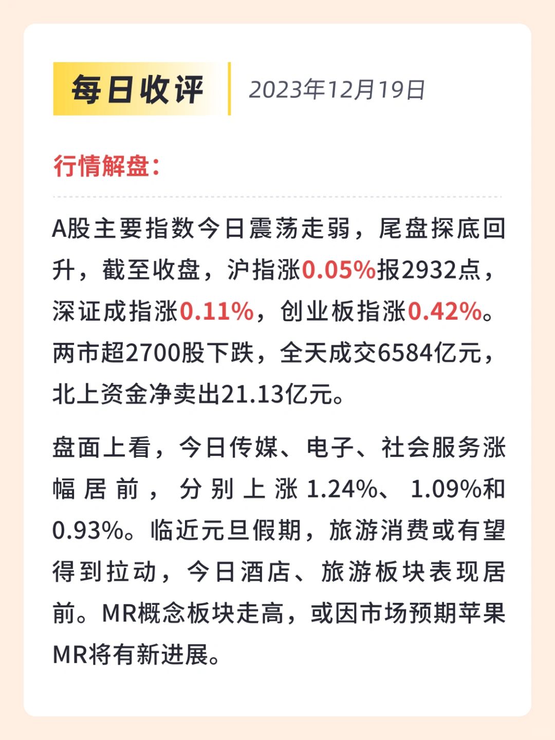 👉 盘面上看,今日传媒、电子、社会服务涨幅居前,分别上涨1.24%、1.09%和0.93%。临近元旦假期,旅游消费或有望得到拉动,今日酒店、旅游板块表现居前。MR概念板块走高,或因市场预期苹果MR将有新进展。
