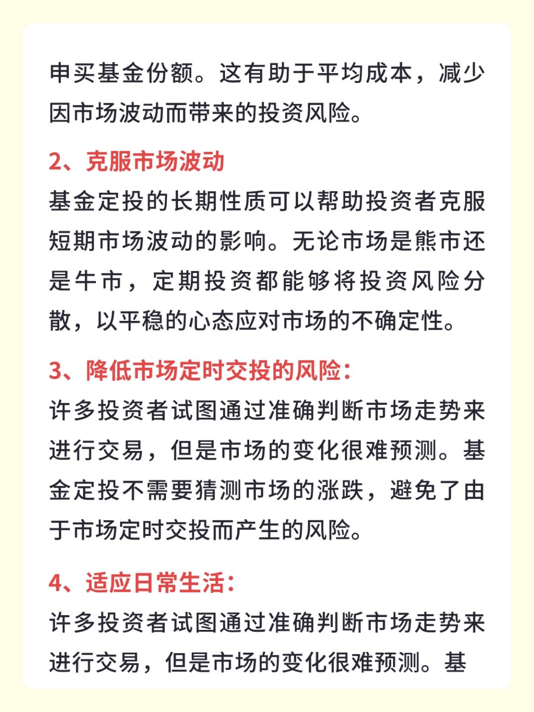 基金定投的长期性质可以帮助投资者克服短期市场波动的影响。无论市场是熊市还是牛市,定期投资都能够将投资风险分散,以平稳的心态应对市场的不确定性。
