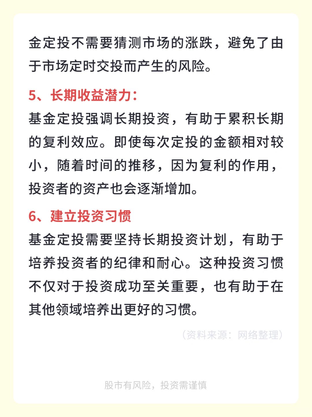 基金定投强调长期投资,有助于累积长期的复利效应。即使每次定投的金额相对较小,随着时间的推移,因为复利的作用,投资者的资产也会逐渐增加。