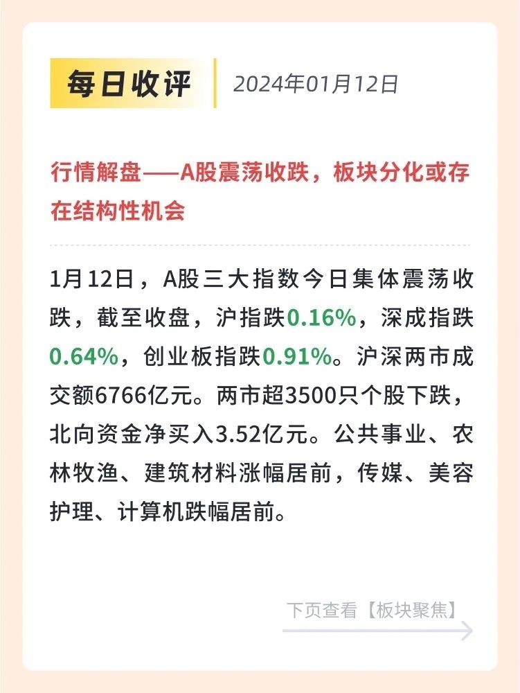 👉 1月12日,A股三大指数今日集体震荡收跌,截至收盘,沪指跌0.16%,深成指跌0.64%,创业板指跌0.91%。沪深两市成交额6766亿元。两市超3500只个股下跌,北向资金净买入3.52亿元。公共事业、农林牧渔、建筑材料涨幅居前,传媒、美容护理、计算机跌幅居前。