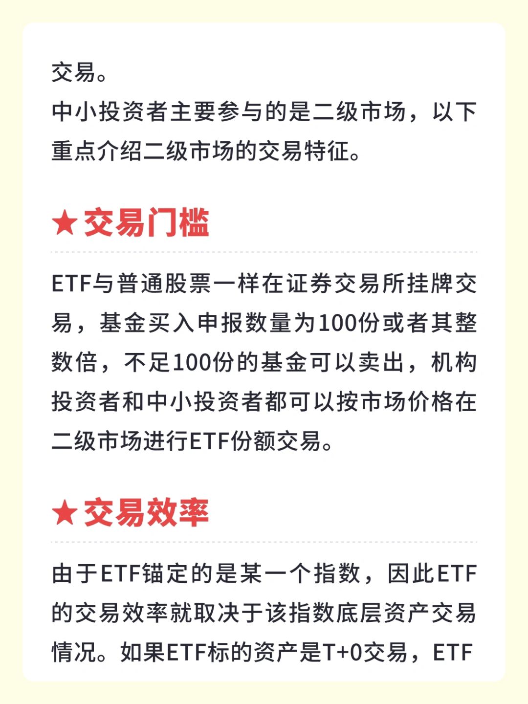 由于ETF锚定的是某一个指数,因此ETF的交易效率就取决于该指数底层资产交易情况。如果ETF标的资产是T+0交易,ETF就是T+0交易,如果ETF标的资产是T+1交易,ETF就是T+1交易。目前A股股票是T+1交易,因此A股ETF就是T+1交易。黄金ETF、债券ETF、货币ETF以及投资于境外资产的跨境ETF可实现T+0交易。