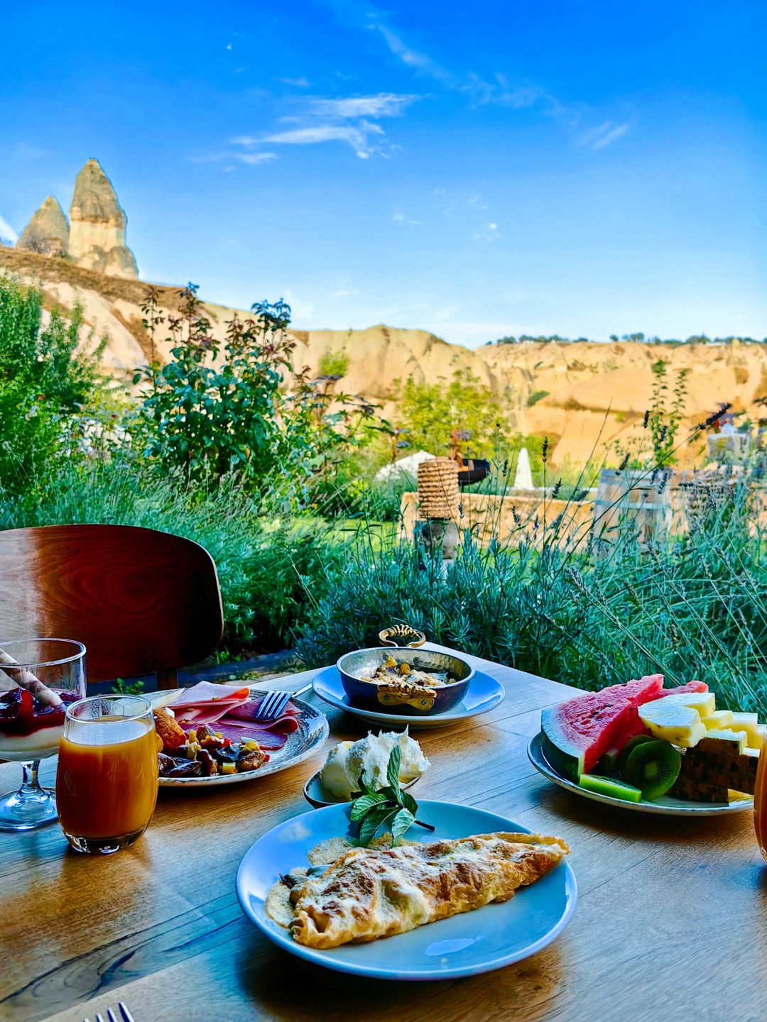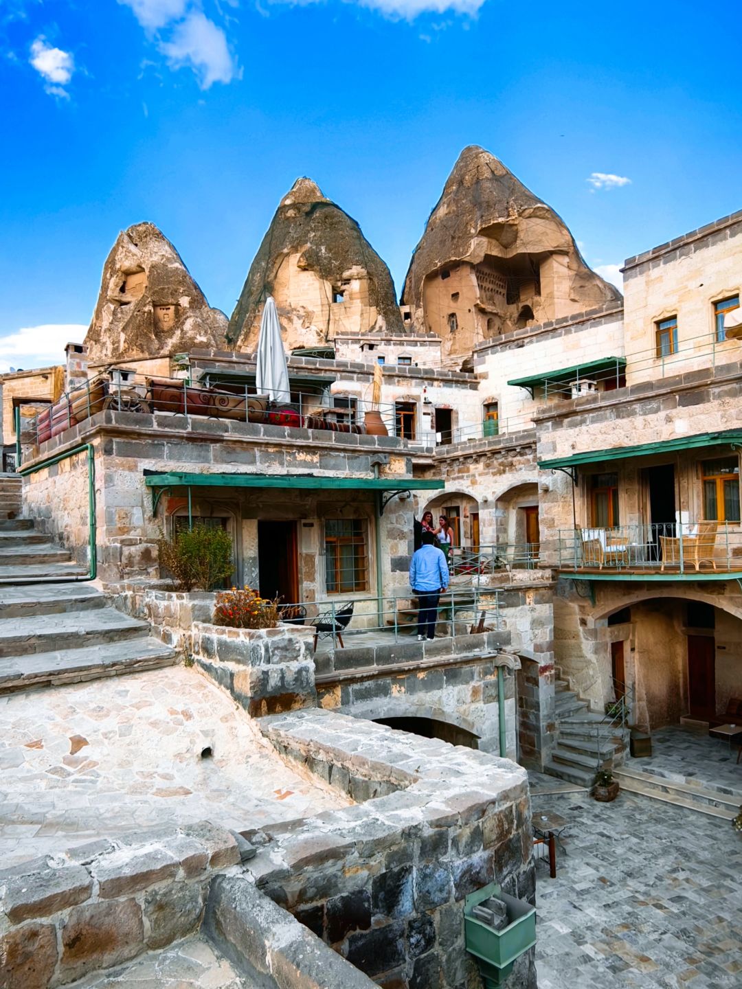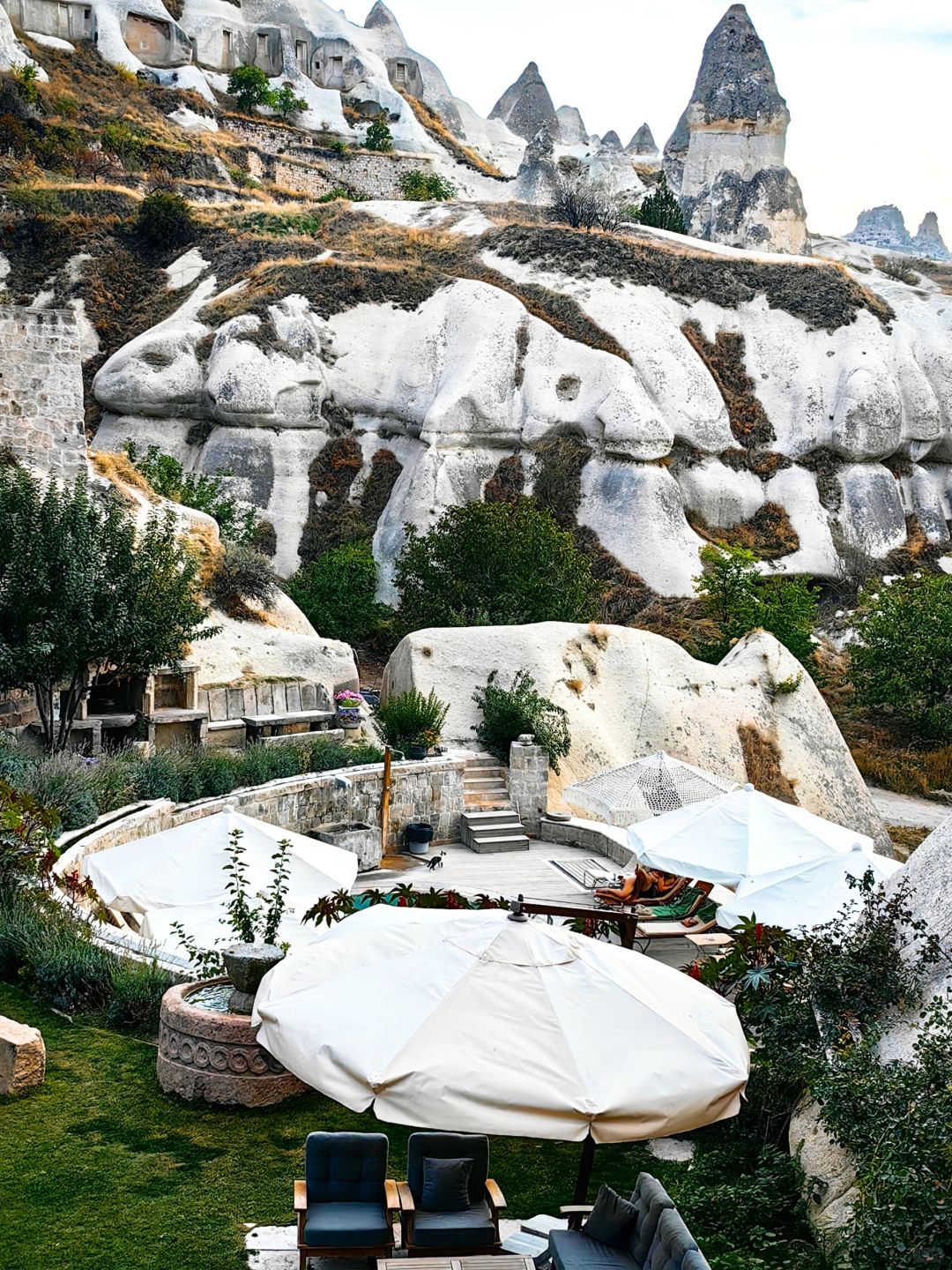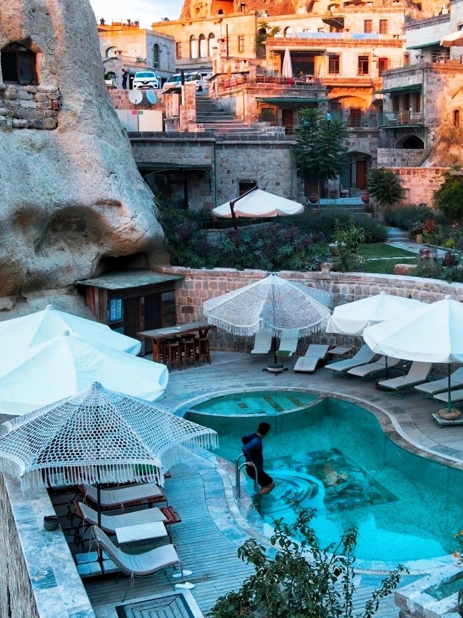 首先公区非常漂亮,当时是一眼被这个网红泳池(图一图二)种草了,实际去确实震撼,旁边就是鸽子谷,经常有小鸽子在泳池旁边玩耍。虽然露台不像大名鼎鼎的sultan或mithra可以俯瞰整个格雷梅小镇,但是也很漂亮(图三),而且,作为AZA住客的隐藏福利,可以免费无限次去sultan或mithra的露台,三家房卡公区通用!而且三个酒店离得都很近。