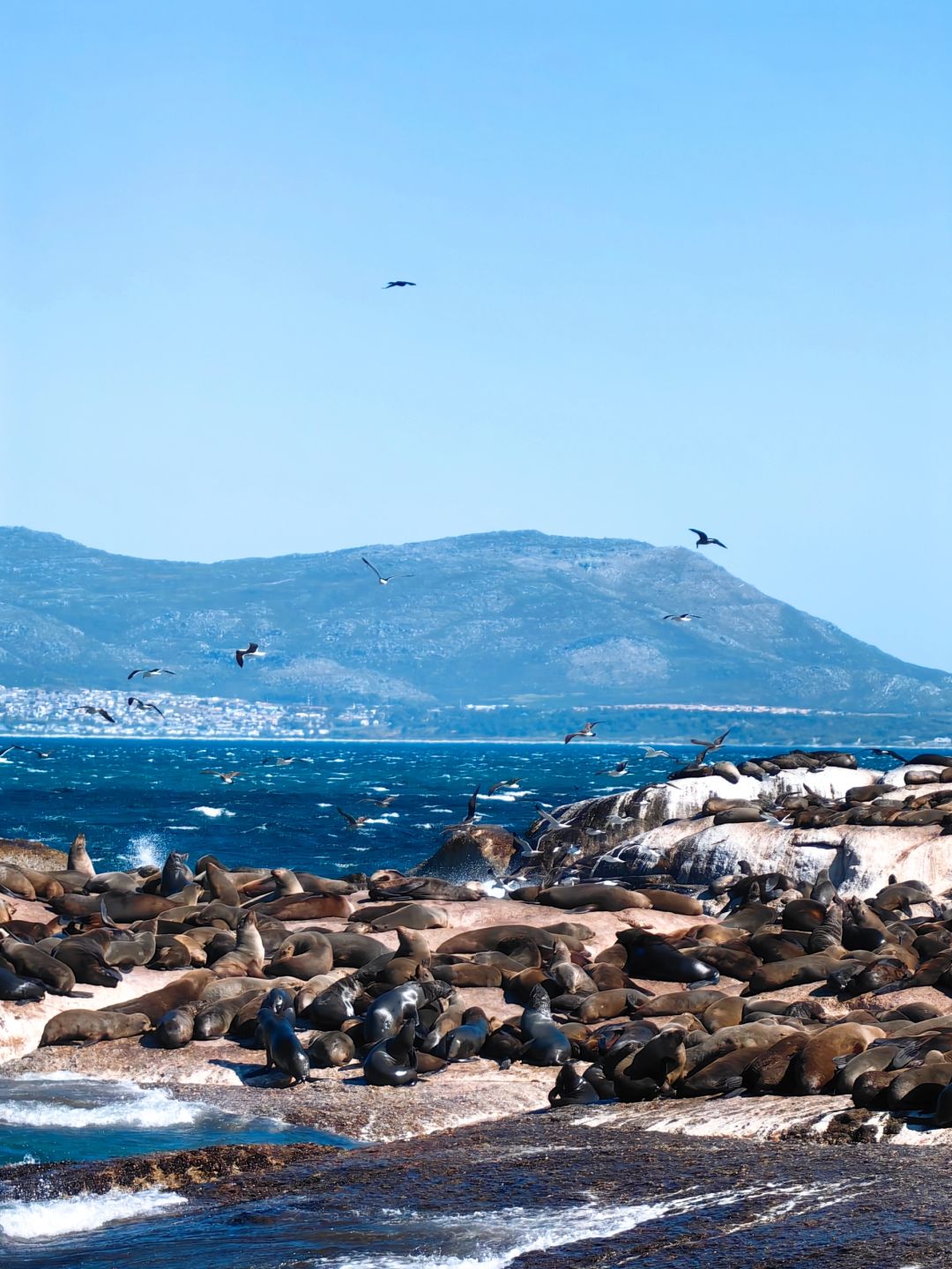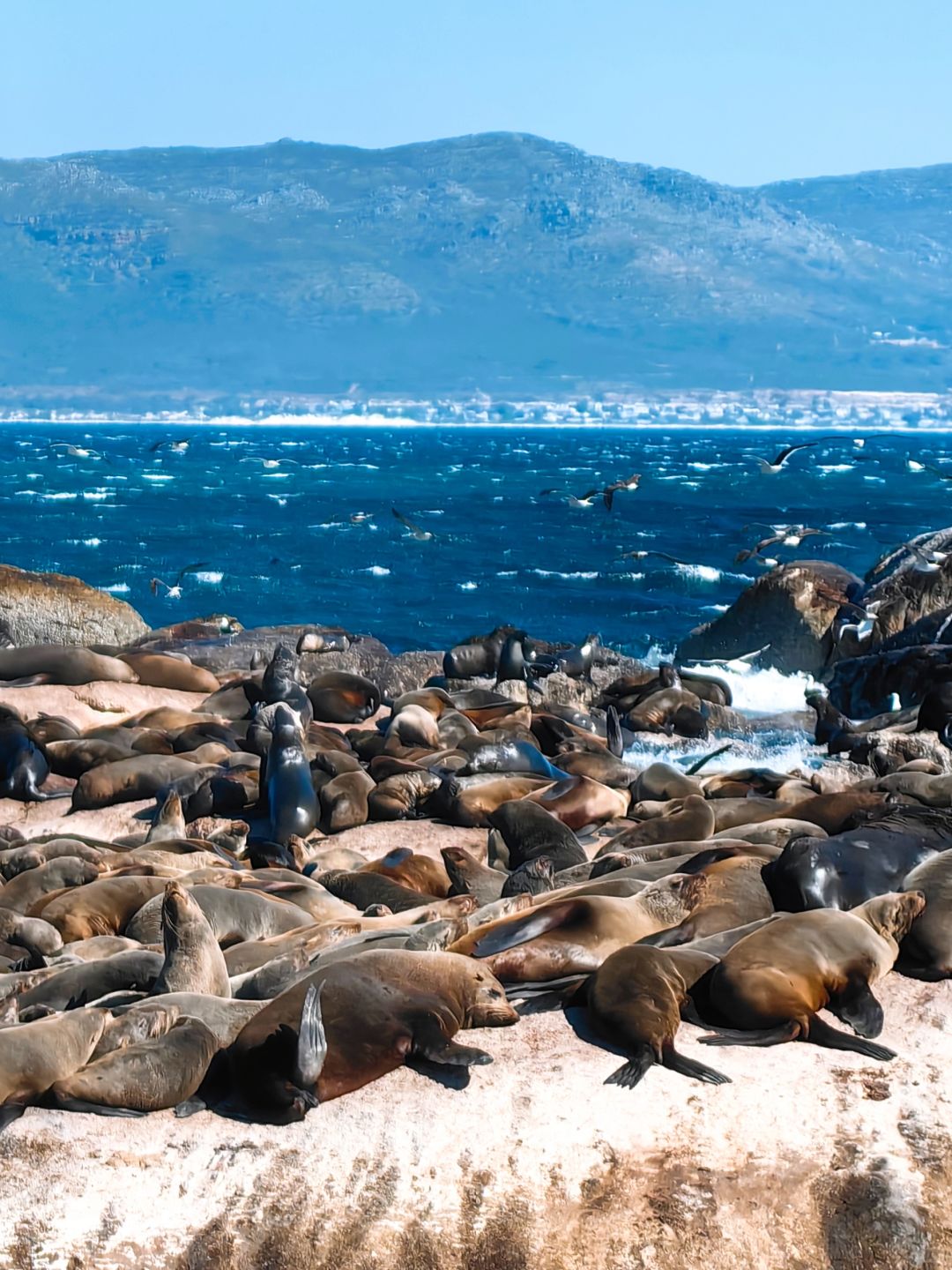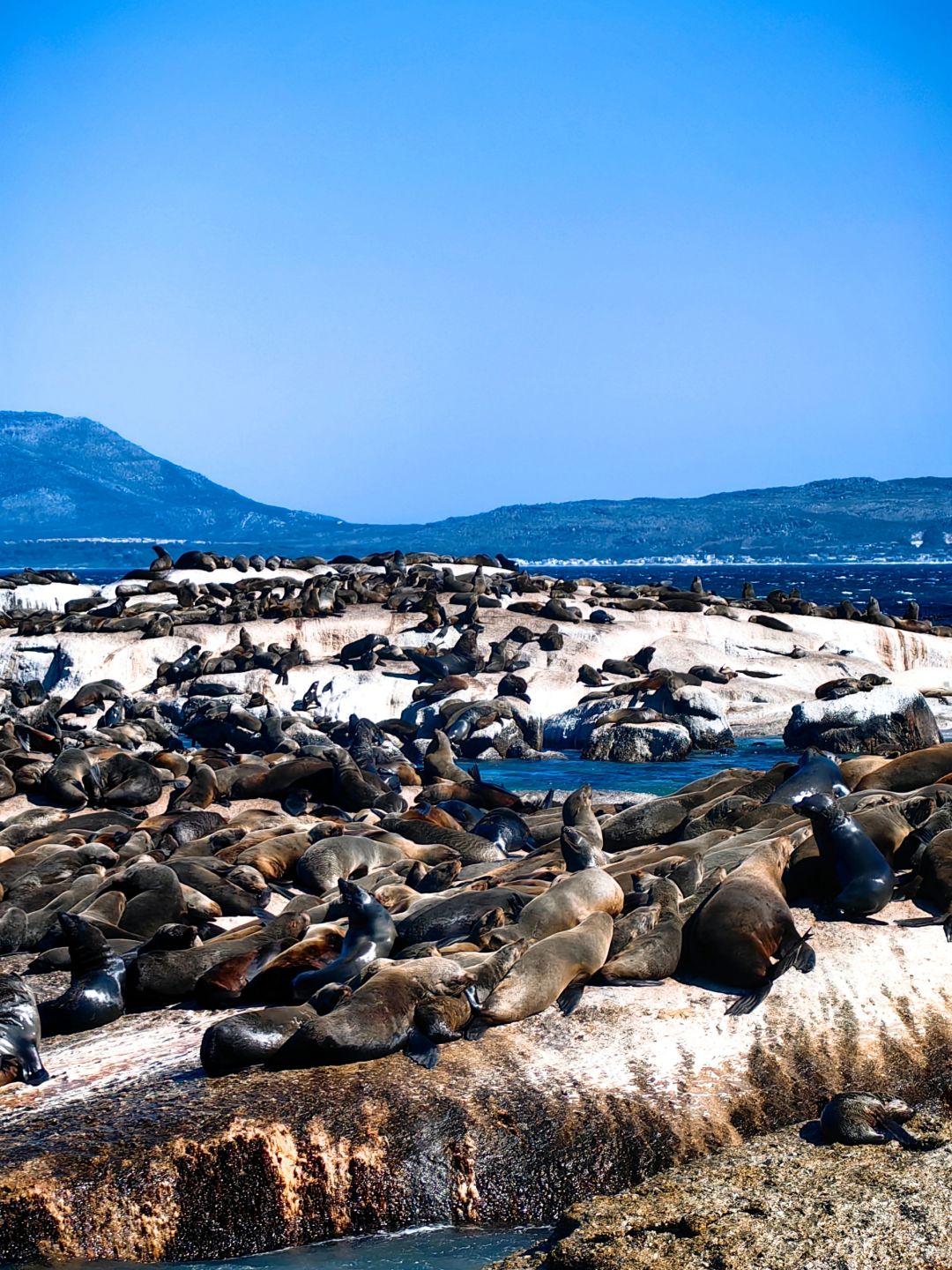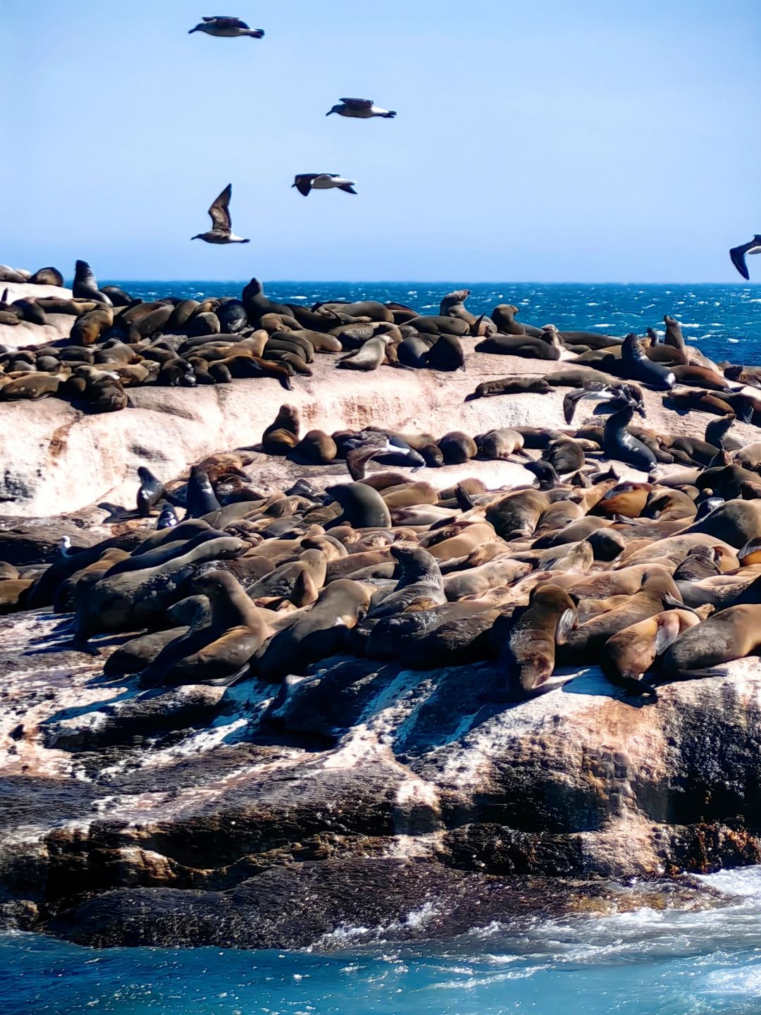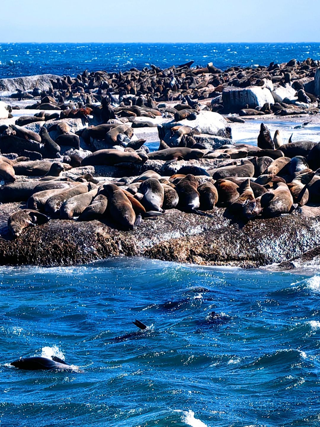 开普敦的豪特湾!开普敦导航Hout bay即可 只要几十块就可以坐船去海豹岛看海豹。去的时候天气非常好,出海就在海豹岛上看到了密密麻麻的海豹,懒洋洋的在晒太阳,还有海鸟和在水里游的海豹