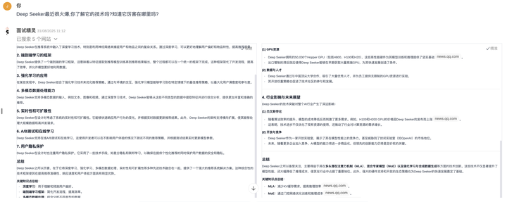面试精灵在语音识别结果"Deep Seeker"虽然不正确,但是最接近真值"DeepSeek"的。大模型纠错后,回复内容正确,并结合了联网搜索对DeepSeek这一较新知识进行RAG检索。