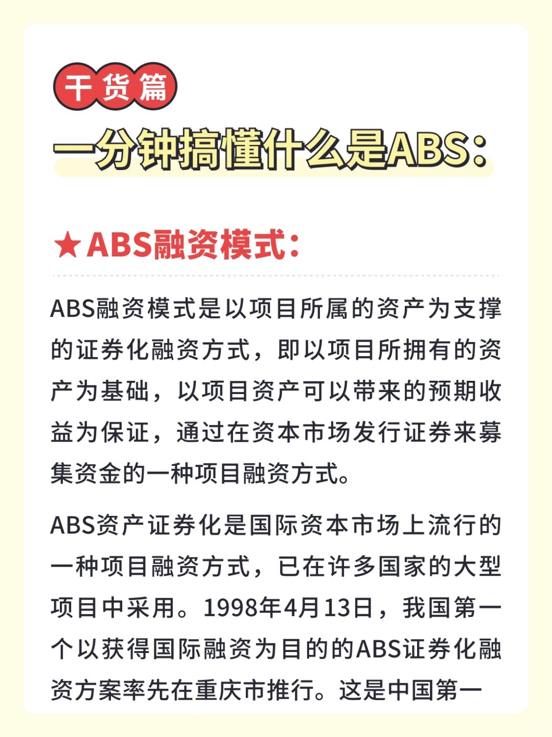 👉 ABS资产证券化是国际资本市场上流行的一种项目融资方式,已在许多国家的大型项目中采用。1998年4月13日,我国第一个以获得国际融资为目的的ABS证券化融资方案率先在重庆市推行。这是中国第一个以城市为基础的ABS证券化融资方案。