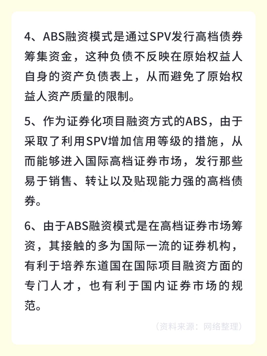 👉 由于ABS融资模式是在高档证券市场筹资,其接触的多为国际一流的证券机构,有利于培养东道国在国际项目融资方面的专门人才,也有利于国内证券市场的规范。