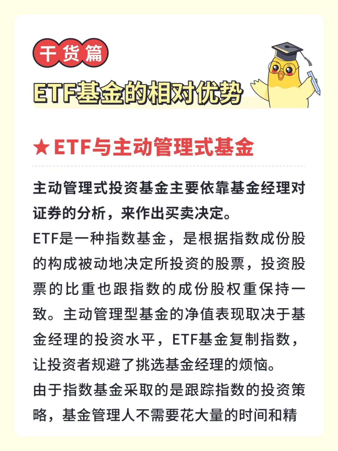 主动管理式投资基金主要依靠基金经理对证券的分析,来作出买卖决定。ETF是一种指数基金,是根据指数成份股的构成被动地决定所投资的股票,投资股票的比重也跟指数的成份股权重保持一致。主动管理型基金的净值表现取决于基金经理的投资水平,ETF基金复制指数,让投资者规避了挑选基金经理的烦恼。