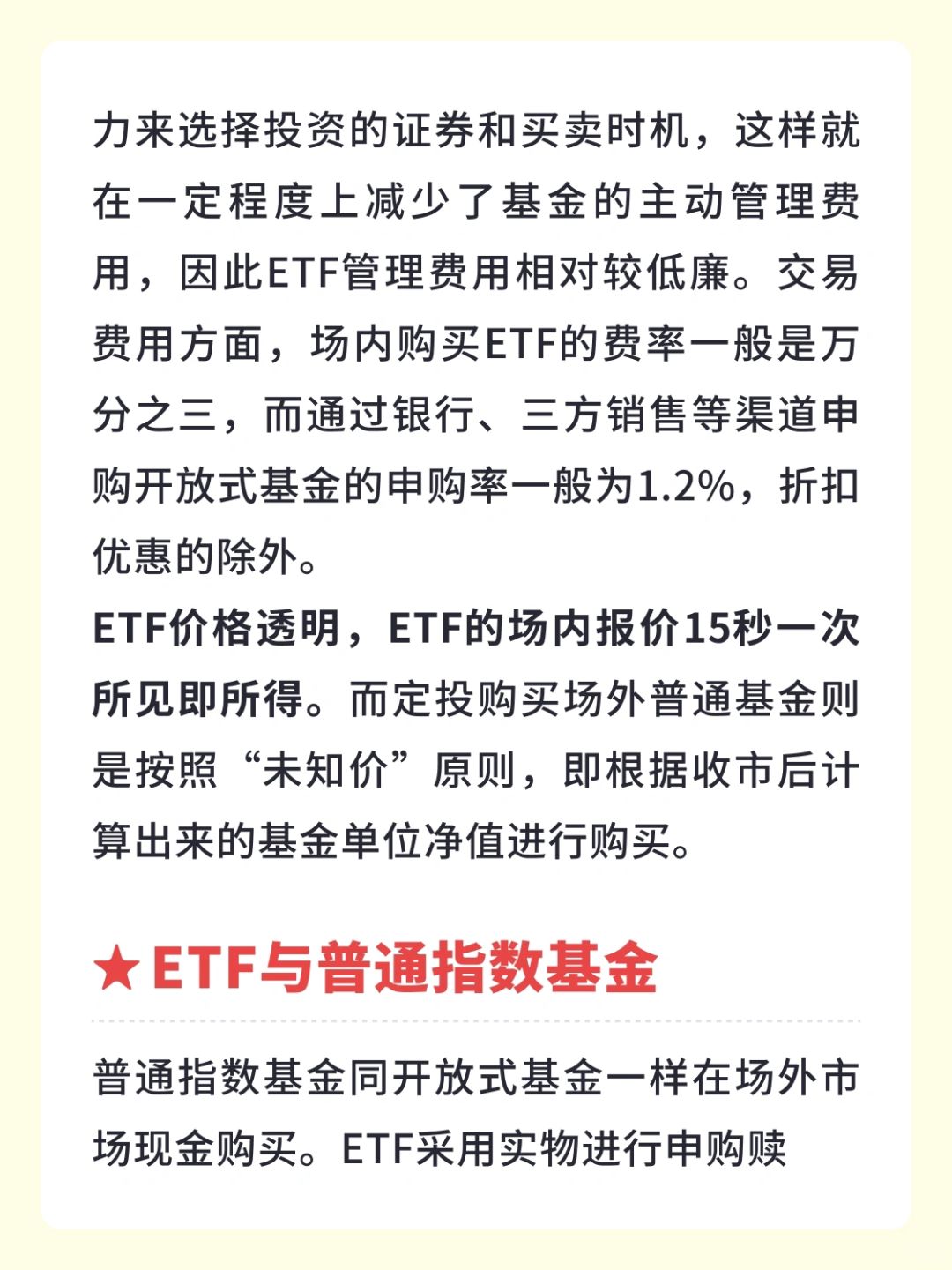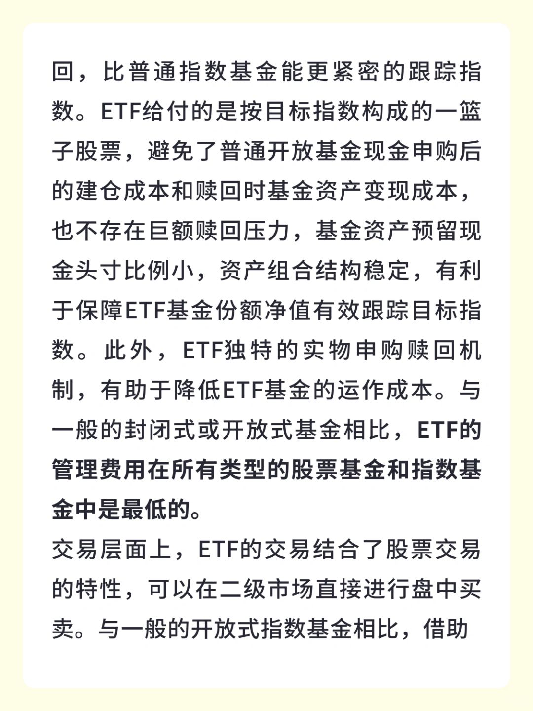 普通指数基金同开放式基金一样在场外市场现金购买。ETF采用实物进行申购赎回,比普通指数基金能更紧密的跟踪指数。ETF给付的是按目标指数构成的一篮子股票,避免了普通开放基金现金申购后的建仓成本和赎回时基金资产变现成本,也不存在巨额赎回压力,基金资产预留现金头寸比例小,资产组合结构稳定,有利于保障ETF基金份额净值有效跟踪目标指数。此外,ETF独特的实物申购赎回机制,有助于降低ETF基金的运作成本。与一般的封闭式或开放式基金相比,ETF的管理费用在所有类型的股票基金和指数基金中是最低的。