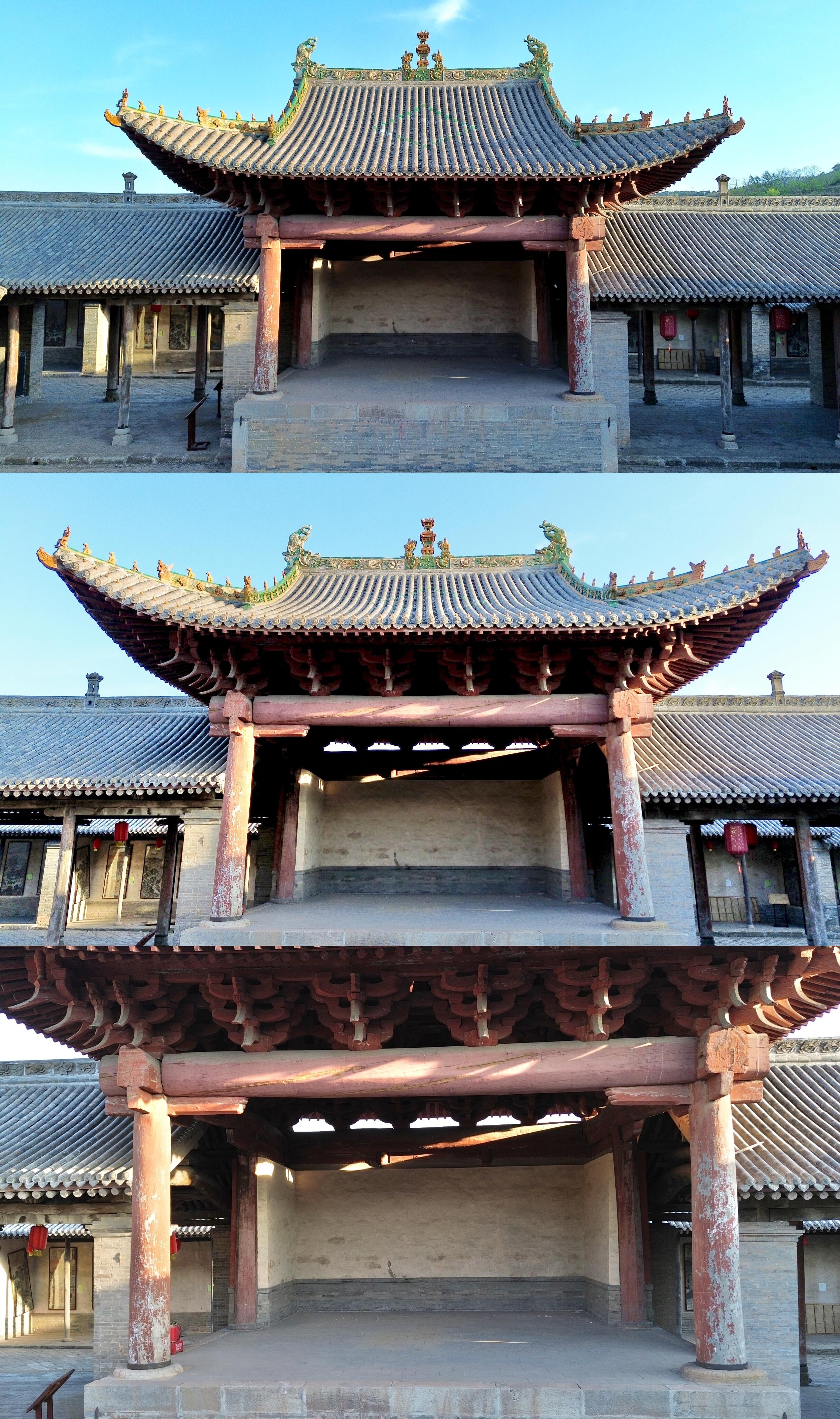 穿过略显狭窄的巷道,推开斑驳的庙门,眼前豁然开朗。四圣宫由西、中、东三院并列而成,如同展开一幅立体的建筑长卷。西侧院落小巧紧凑,曾作为禅堂与客舍,如今虽已空置,仍能从青砖灰瓦间窥见昔日僧侣往来的身影。东侧的关帝庙是清嘉庆年间增建,独立的戏台与规整的配殿,为这座元代古建注入了清代的建筑语言。而最引人注目的,当属居中的主院落——这里不仅是祭祀四圣的核心区域,更藏着整座建筑群的灵魂:一座体量惊人的元代戏台。