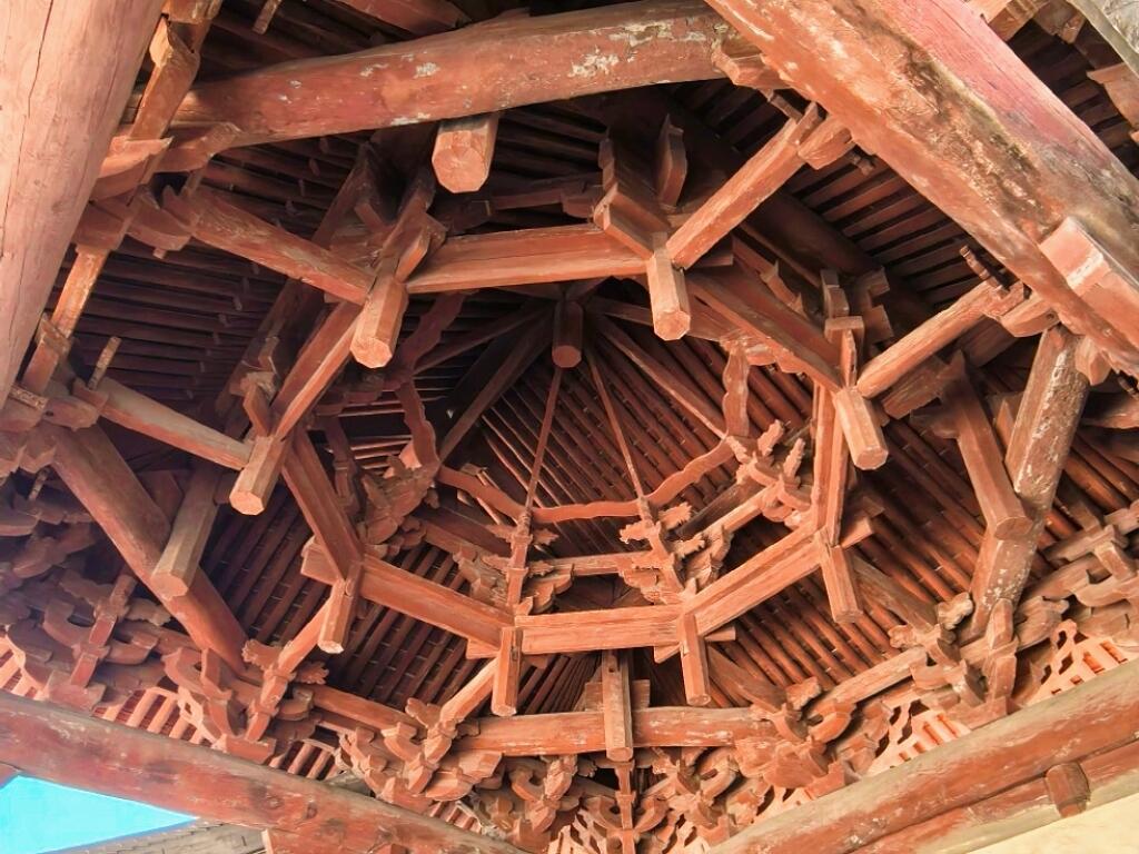 凑近观察,戏台的细节更令人称奇。大额枋上,五铺作斗拱整齐排列,四转角处的鸳鸯交首栱如同交颈而舞的飞鸟,精巧又不失力量感。45°斜栱从斗拱中斜出,打破了传统建筑的横平竖直,为整体造型增添了灵动气息。顺着视线向上,四角抹角梁层层叠叠,老角梁托起垂柱,最终汇聚于顶部的雷公柱,形成精美的斗八藻井。八攒斗拱如同绽放的花朵,将光线引入戏台内部,每一根木构件都在用最直白的方式展示着元代建筑的雄浑与奔放。