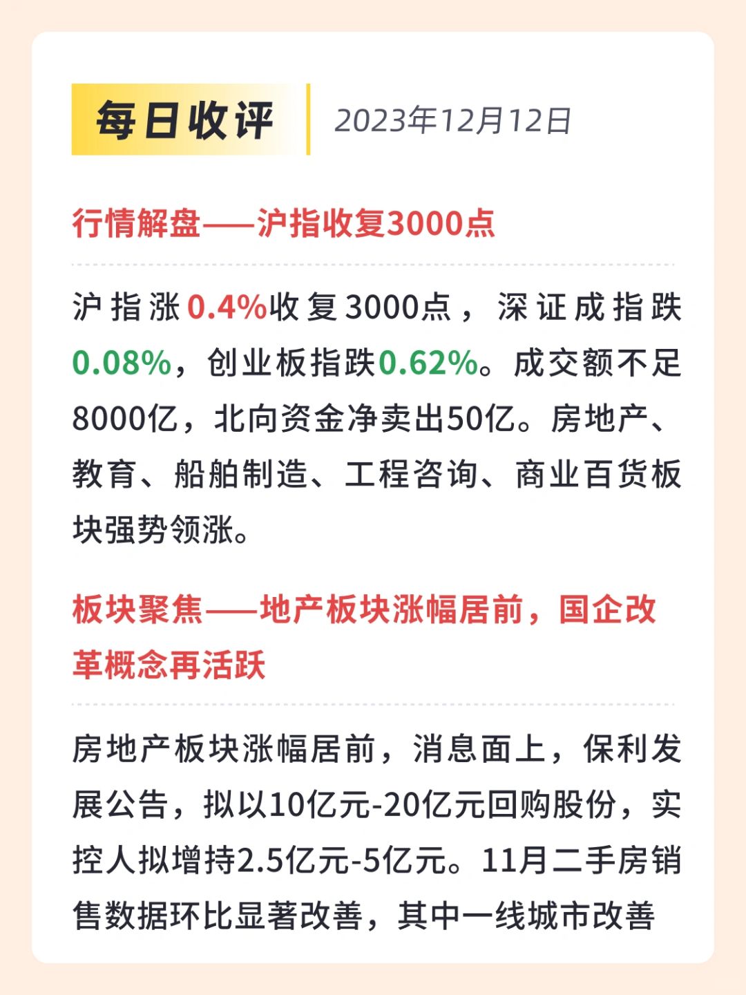 👉 沪指涨0.4%收复3000点,深证成指跌0.08%,创业板指跌0.62%。成交额不足8000亿,北向资金净卖出50亿。房地产、教育、船舶制造、工程咨询、商业百货板块强势领涨。