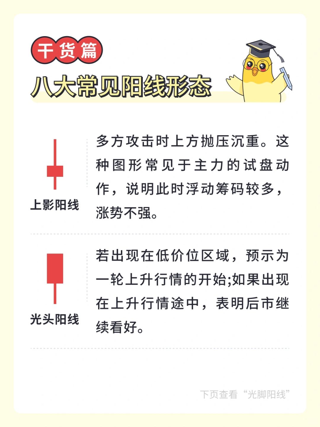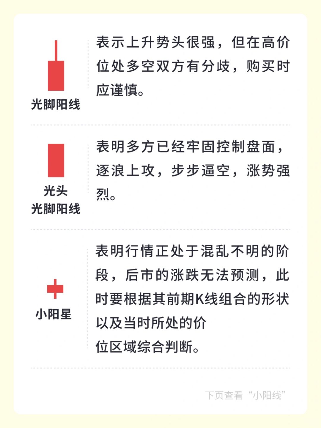 光脚阳线:表示上升势头很强,但在高价位处多空双方有分歧,购买时应谨慎。