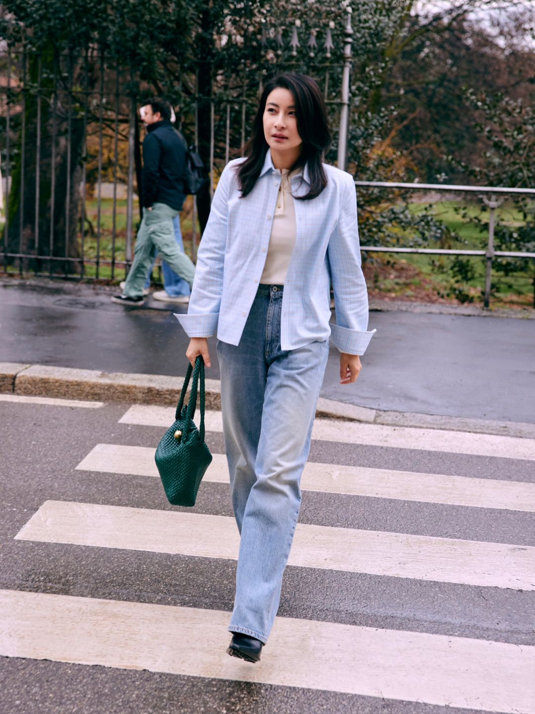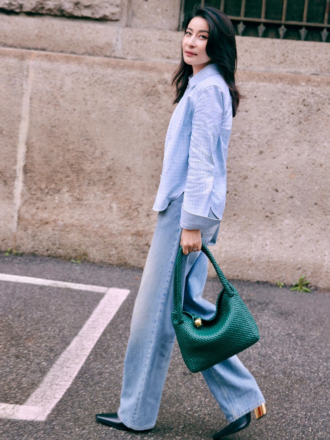 郭晶晶去米兰时装周看秀了 蓝色衬衫搭配牛仔裤编织包 全身简单低调 很符合她的气质个性 一如既往的低调风!