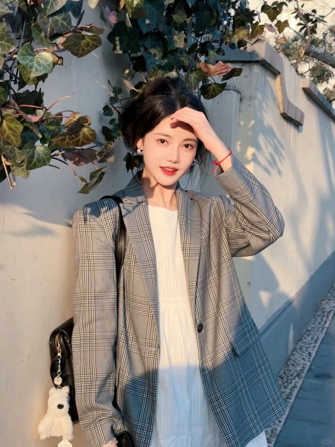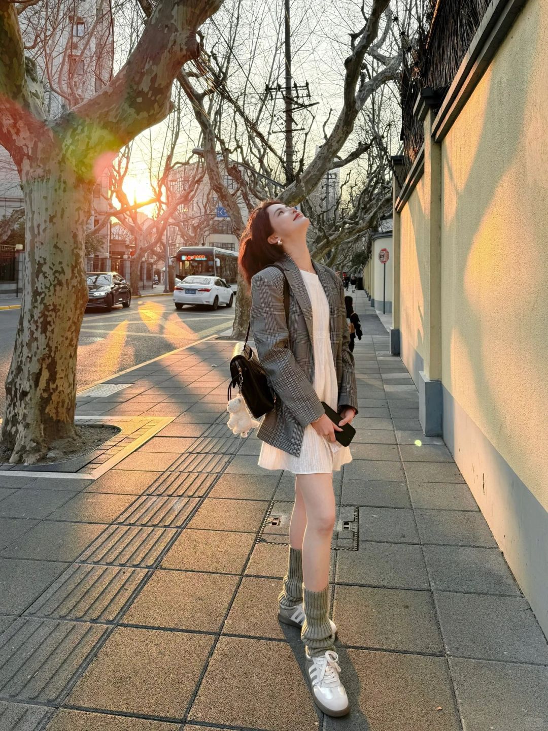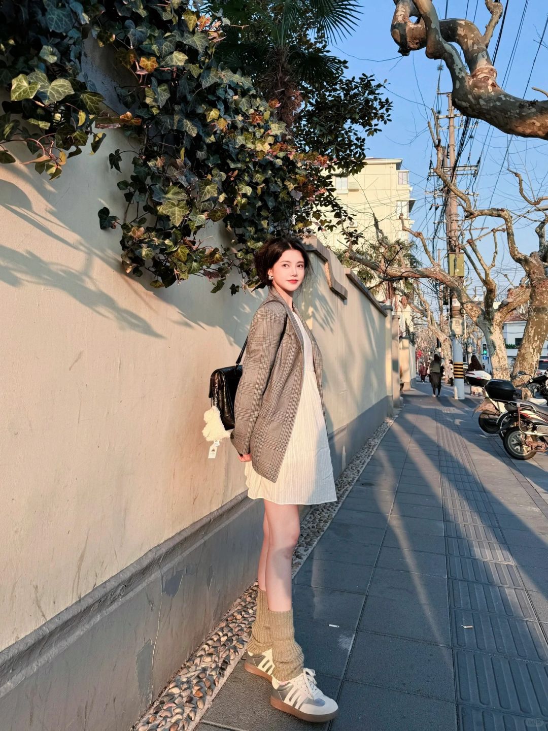 孙珍妮晒出了元宵节随拍 西装小白裙搭配银色德训鞋 格雷系配色 慵懒又时髦 超显腿长的一身 🎀