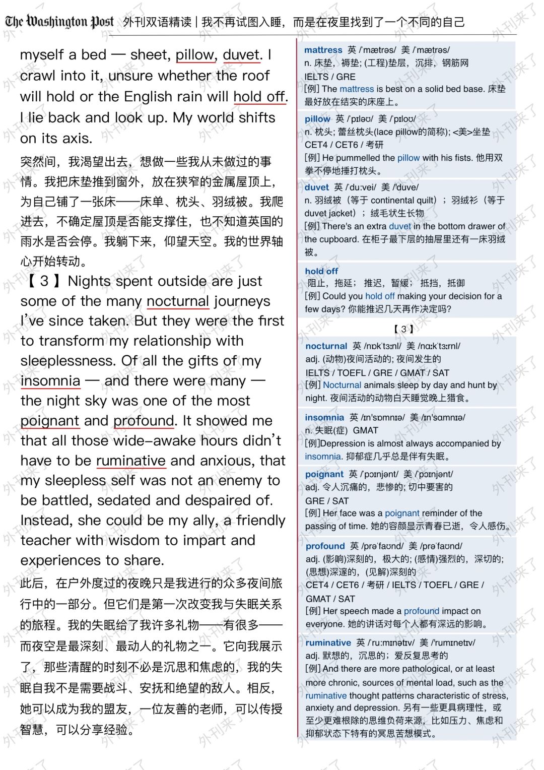 🔥英语学习必备的外刊精读 ⭐选自The Washington Post ⭐每周会从原刊中选取多篇文章精读 🏆🏆重点单词⤵️ 🏅crescent 月牙形 🏅flicker 闪烁 🏅mattress 床垫 🏅duvet 羽绒被 🏅hold off 阻止 🏅insomnia 失眠症 🏅poignant 沉痛的 🏅profound 影响深刻的 🏅ruminative 沉思的 🏅virtually 事实上 🏅restive 不耐烦的 🏅courtesy 礼貌