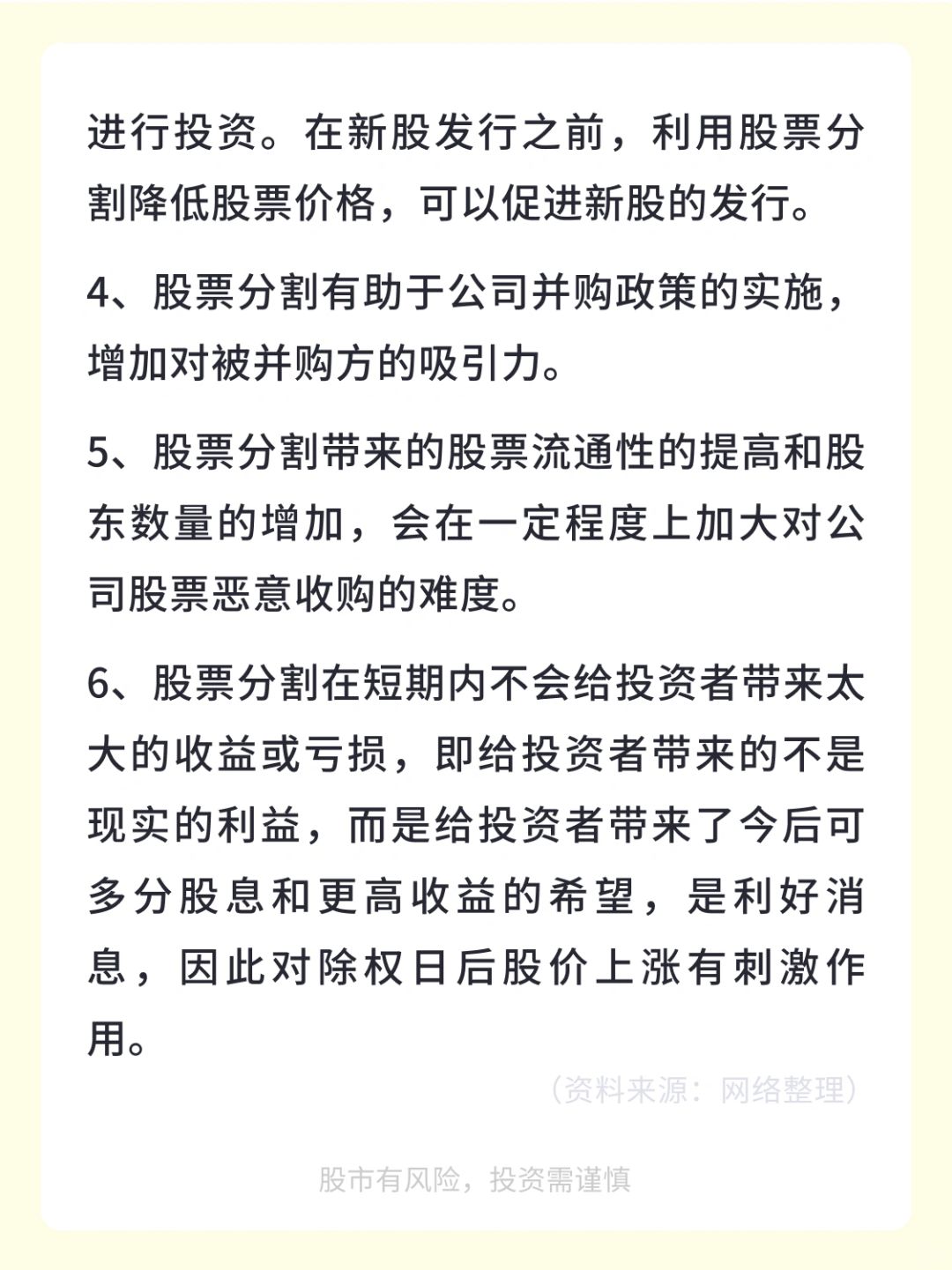 👉 股票分割在短期内不会给投资者带来太大的收益或亏损,即给投资者带来的不是现实的利益,而是给投资者带来了今后可多分股息和更高收益的希望,是利好消息,因此对除权日后股价上涨有刺激作用。