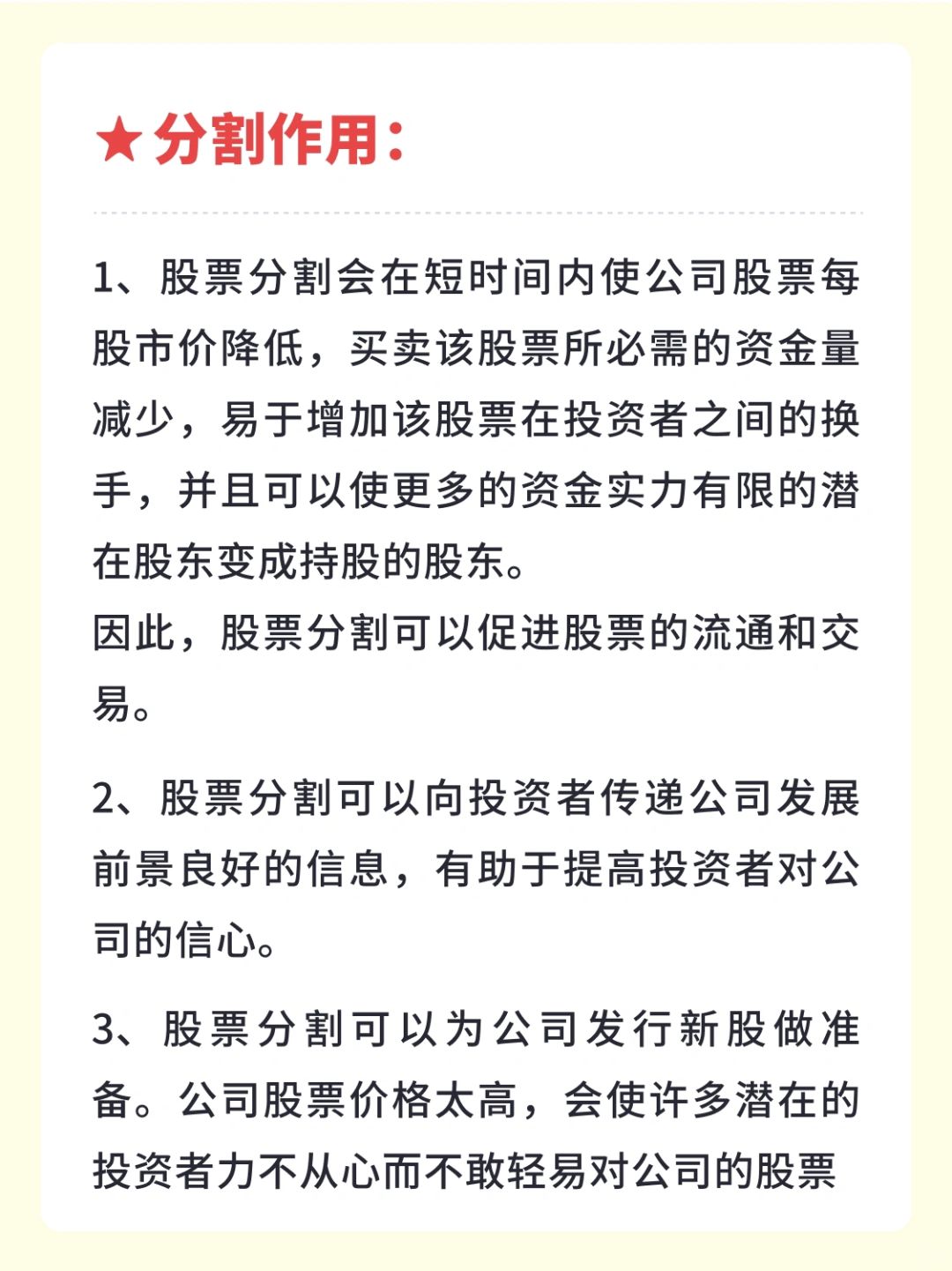 👉 股票分割会在短时间内使公司股票每股市价降低,买卖该股票所必需的资金量减少,易于增加该股票在投资者之间的换手,并且可以使更多的资金实力有限的潜在股东变成持股的股东。因此,股票分割可以促进股票的流通和交易。