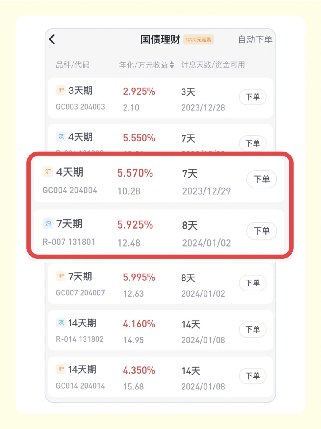 平安圣诞来啦!✨🥰❄️ 国债理财送您圣诞惊喜!🎁🎁 截止当前, 7天期国债理财收益率最高超6%,4天期国债理财收益率超5.7%!👍 登录多多金APP,点击【淘金-理财-国债理财-下单】购买吧! 购买小诀窍:今日购买4天期国债理财,可享7天收益哟!🔆🔆 [集美R]嘿,宠粉我是认真的,希望可以帮到你~