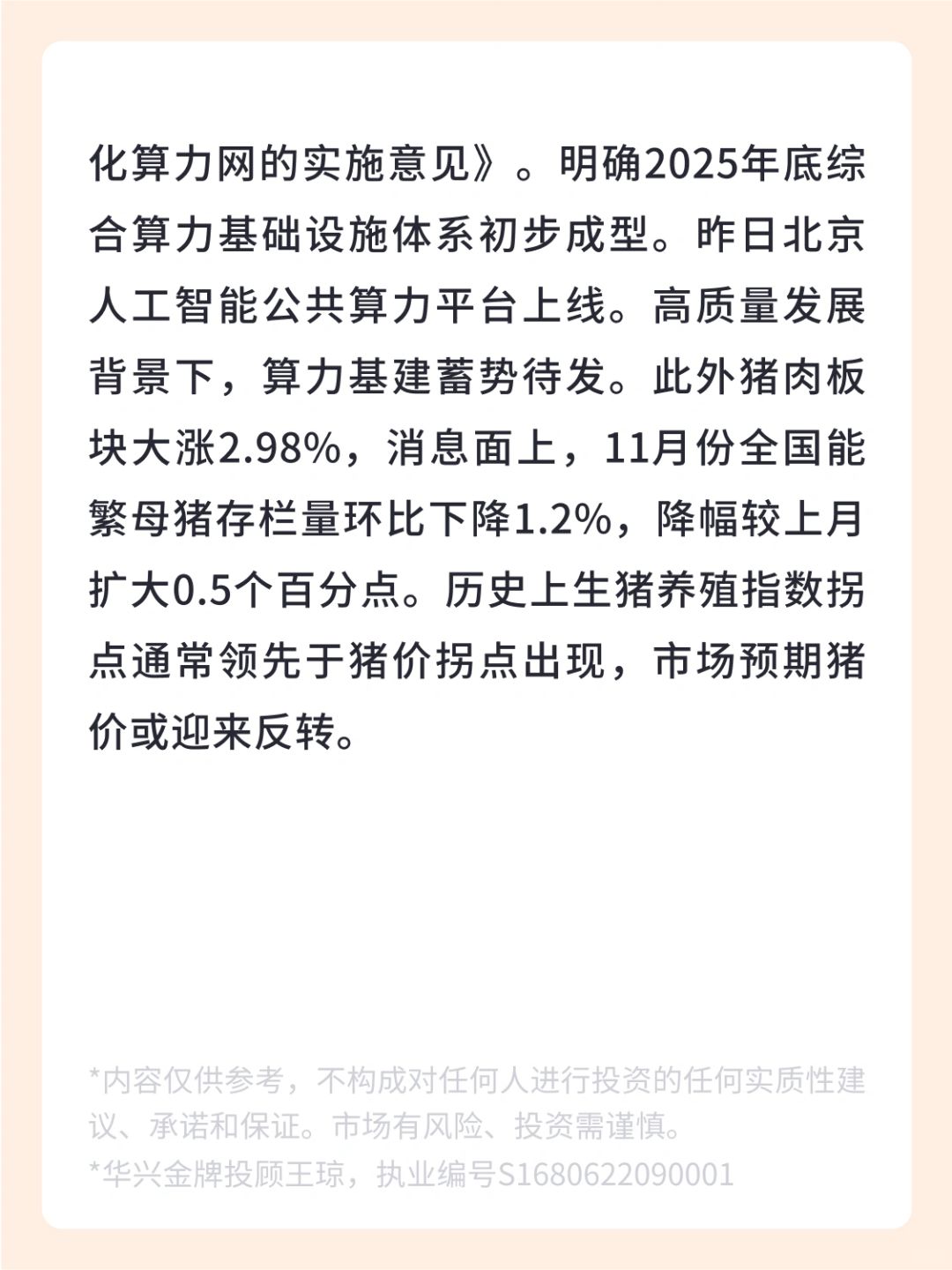 👉 今日算力板块走强,消息面上,国家发展改革委、国家数据局、中央网信办、工业和信息化部、国家能源局近日印发《深入实施“东数西算”工程 加快构建全国一体化算力网的实施意见》。明确2025年底综合算力基础设施体系初步成型。昨日北京人工智能公共算力平台上线。高质量发展背景下,算力基建蓄势待发。此外猪肉板块大涨2.98%,消息面上,11月份全国能繁母猪存栏量环比下降1.2%,降幅较上月扩大0.5个百分点。历史上生猪养殖指数拐点通常领先于猪价拐点出现,市场预期猪价或迎来反转。
